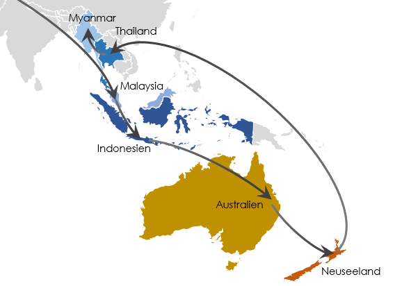 Wir starten wie schon erwähnt am 03.06.2019 Richtung Malaysia. Um unserer Reise dort eine Richtung zu geben, haben wir uns über ein paar Ecken informiert und eine grobe Route geplant. Aber auch dazu später mehr. Nach Malaysia steht Indonesien mit der Hauptinsel Java und Bali auf dem Programm. Aber auch hier gibt es schon die Überlegungen Sumatra oder weitere Inseln zu bereisen. Wir schauen mal, wo es uns so hin verschlägt. Anschließend steht der kleine Subkontinent Australien an. Da wir durch Tamaras England-Aufenthalt einen „local/matey“ kennen und der Wunsch besteht diesen zu besuchen, wird es wohl die Ostküste werden. Vielleicht aber auch nicht oder vielleicht auch doch – wir schauen mal. Neuseeland! Zunächst ist hier die Nordinsel angedacht. Aber durch Tipps, Gespräche und Recherchen in den letzten Tagen sind wir uns nicht mehr sicher, ob es dabei bleiben wird. Die Zeit (und das Geld) sind für beide Inseln wohl eng und das Programm würde sehr straff – aber vielleicht lohnt es sich ja?!