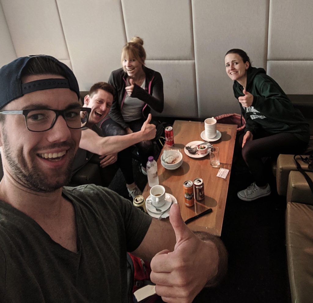 Etwas entspannter – wir konnten an der Situation ja nichts mehr ändern – suchten wir den nächsten Lufthansa-Serviceschalter auf. Wir bekamen eine Umbuchung über Bangkok nach Kuala Lumpur mit ThaiAirways. Boarding time sollte 14:05 sein. Wir verbrachten die nächsten knapp zwei Stunden damit unsere Leidensgenossen Anka und Florian näher kennen zu lernen und tauschten uns über unsere strapaziöse Anreise aus. Das Boarding verlief dieses Mal reibungslos. Der Flieger war etwas größer, das Personal etwas asiatischer. Schon bald hörten wir das Kommando des Kapitäns für das Boardpersonal, dass sie sich bereit zum Losrollen machen sollen. Es passierte nur nichts. Was war los? Schon bald darauf die Durchsage des Kapitäns: „Auf Grund von Unwetter und Gewittern ist der gesamte Frankfurter Flughafen auf unbestimmte Zeit gesperrt“. Ernsthaft? Sind wir bei der versteckten Kamera? Vor lauter Unglaube mussten wir erstmal Lachen. Um das Ganze abzukürzen: Wir warteten drei Stunden bis zum Abflug. Tamara bekam zu alle dem auf halber Strecke nach Bangkok noch eine Bierdusche von einer Stewardess.