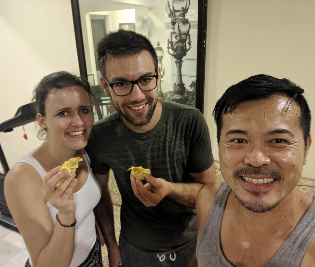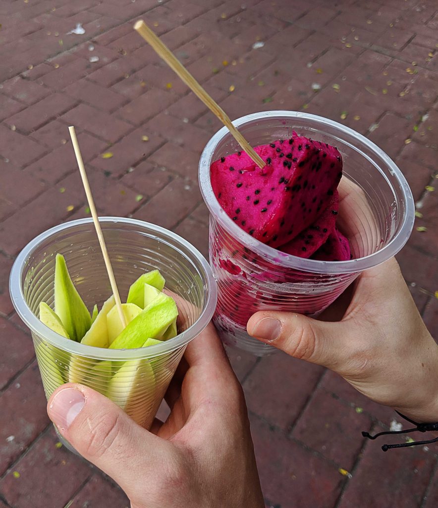 Ein weitere kulinarische Begegnung hatten wir in unserem Apartment. In einem netten Pläuschchen mit unserem Zimmernachbarn Tommy, erzählte uns dieser, dass er am nächsten Tag abreisen würde. Er hatte aber noch kurz zuvor eine frische Durian Frucht auf dem Markt gekauft und brauchte unsere Hilfe, um diese aufzufuttern. „We have to eat it on the balcony […]“ „before you put it in your mouth you have to cover your nose“. Schon Tage zuvor ist uns in den Straßen der Duft von vergammeltem Obst aufgefallen – wie sich herausstellte war es Durian. Tatsächlich war der Geschmack gar nicht schlecht und mit nichts vergleichbar, was wir bis dato gegessen hatten – also einfach mal drauf einlassen!