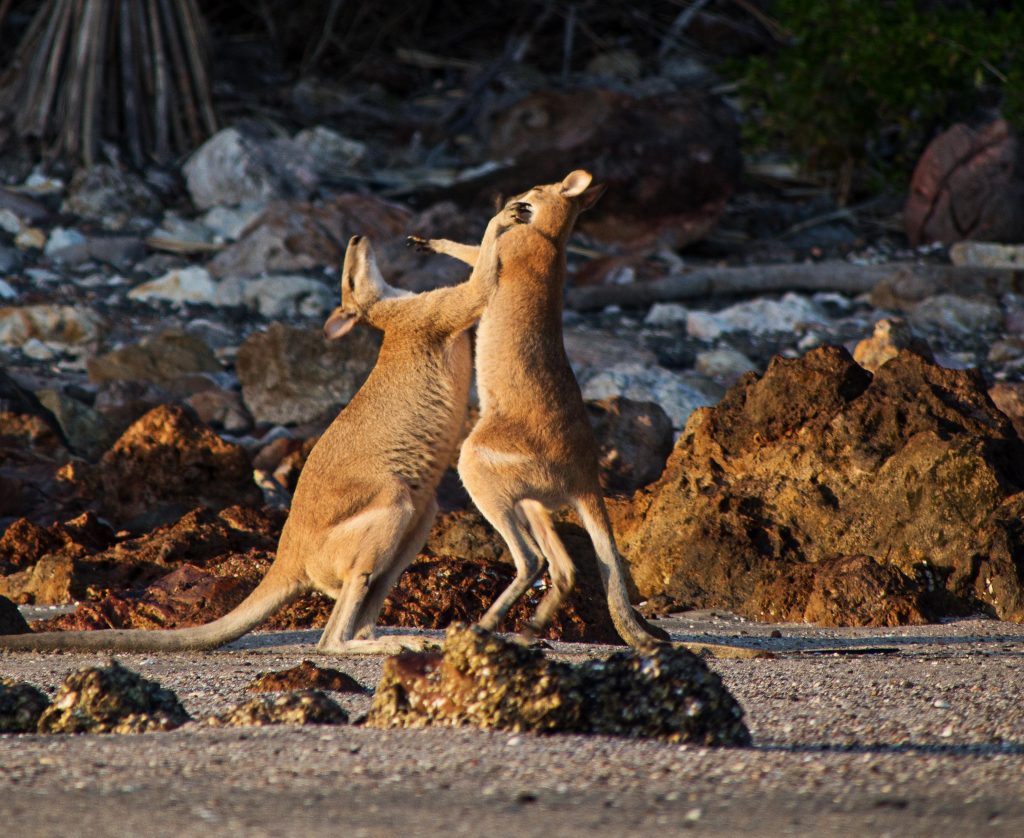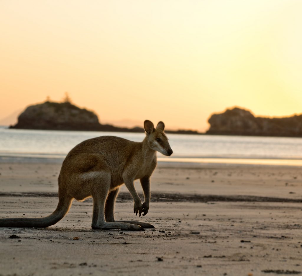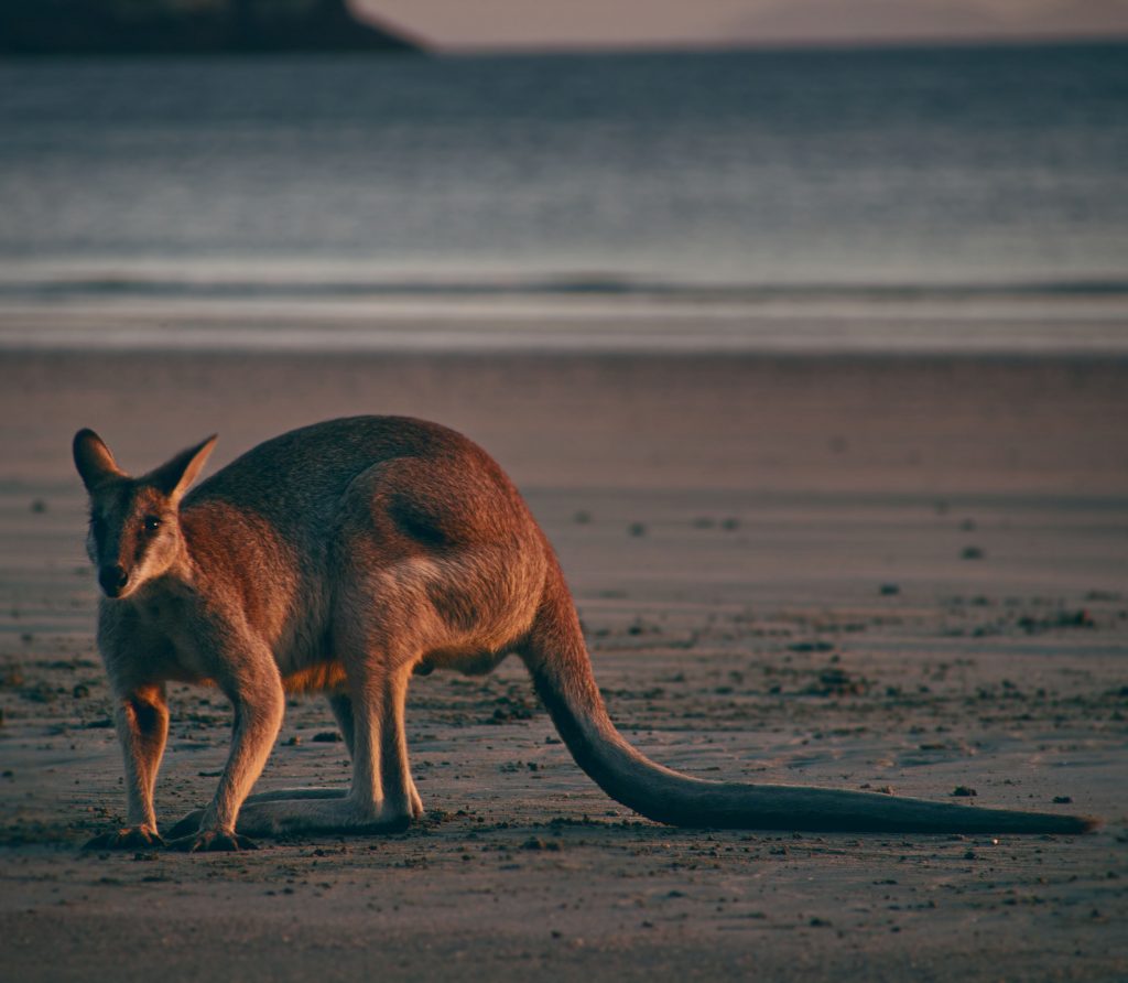 Kurz vor Cape Hillsborough liegt das The Leap Hotel und Pub. Die Besitzer erlauben Campern auf einer Rasenfläche die Nacht zu verbringen, in der Hoffnung, dass sie den Pub besuchen. Nach einer kurzen Nacht ging es für uns um 04:30 zum Cape Hillsborough Beach, um dort Kängurus und Wallabys zu sehen. Wir wurden nicht enttäuscht! Ein cooler Sonnenaufgang am Strand gepaart mit neugierigen und gar nicht scheuen Beuteltieren. Leider sind sie nicht mehr scheu, da sie es gewöhnt sind, dass Menschen sie beobachten. Sie werden mit speziellem Antiwurm-Futter angefüttert. Trotzdem war es ein schöner Anblick, diese Tiere in freier Wildbahn zu sehen. Wir haben jetzt auch verstanden, woher der Stereotyp von boxenden Kängurus/Wallabys kommt. 😉