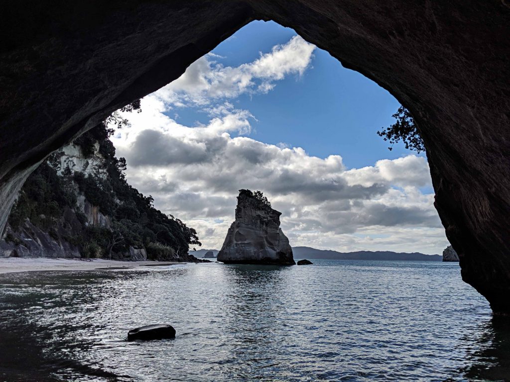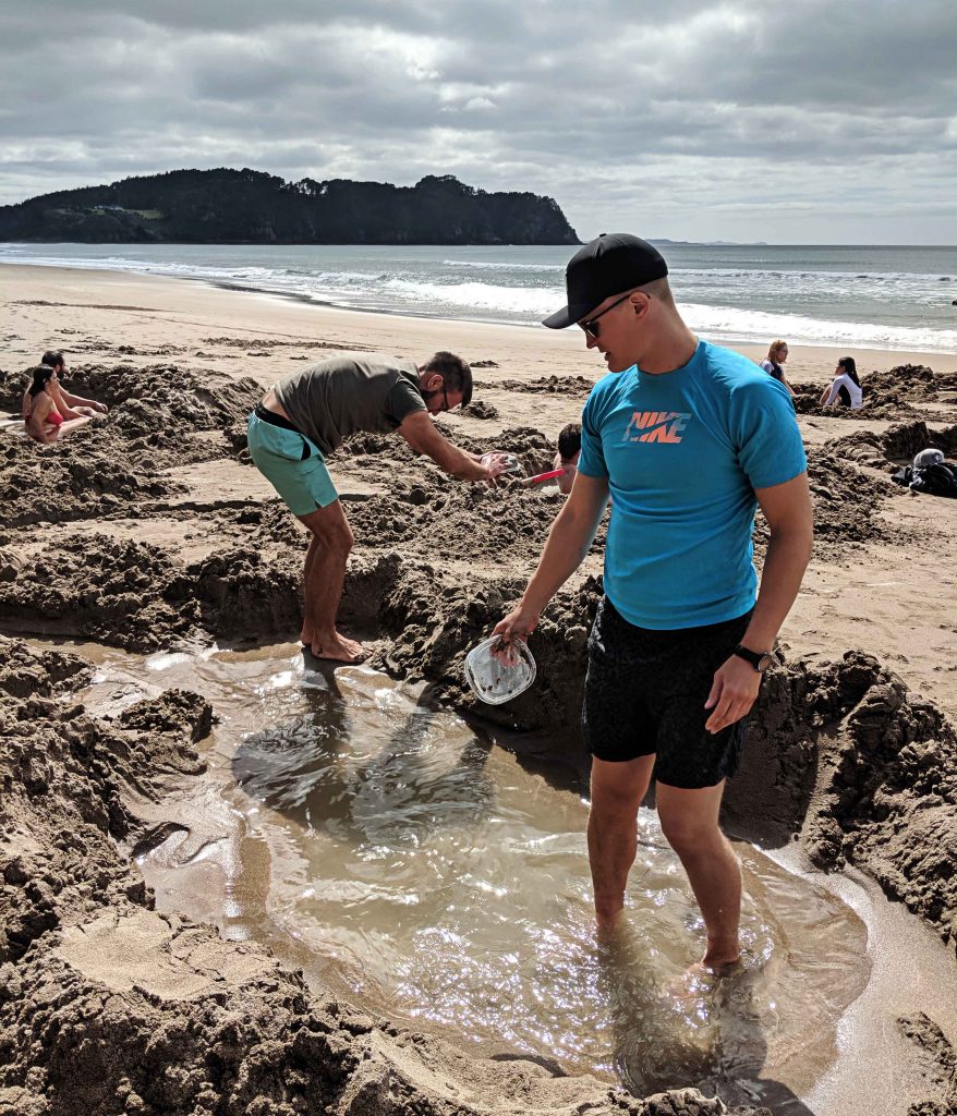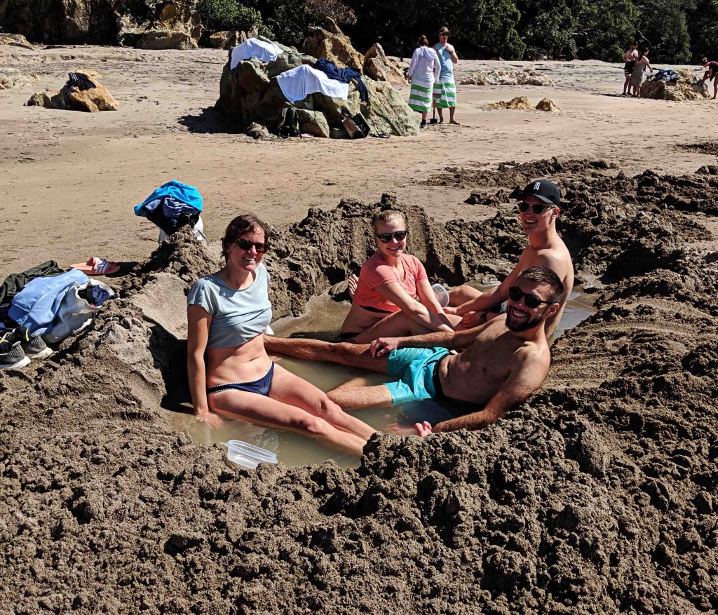 Da am Abend dann doch die Erschöpfung und der Muskelkater einsetzten, stand für den nächsten Tag etwas Entspannung auf dem Programm: Der Hot Water Beach. Wie der Name schon verrät, bietet dieser Strand eine Besonderheit. Unter der Erde befinden sich heiße Quellen. Wenn man also an bestimmten Stellen ein Loch gräbt, strömt das heiße Wasser nach oben und man erhält seinen eigenen Pool mit heißem Wasser. Oder man macht es wie wir und setzt sich in ein bereits gegrabenes Loch vom Vorgänger 😉 So saßen wir also mit einer Menge anderer Leute im neuseeländischen Winter mit Badeklamotten in den heißen Pools am Strand und erfrischten uns (kaum zu glauben) danach sogar im eiskalten Ozean, weil uns so warm wurde. Selbst die beiden Finnen hatten das Gefühl in einer Sauna zu sitzen und das soll schon was heißen! Das Wasser wird stellenweise tatsächlich so heiß, dass man Eier darin kochen kann. Beim Buddeln ist also etwas Vorsicht geboten – was auch wir zu spüren bekamen, also Manu etwas zu ambitioniert tiefer grub. Nach der Entspannung konnten wir es dann doch nicht ganz lassen und machten noch eine kleine Wanderung vom Hahei Beach entlang der Küste zur bekannten Cathedral Cove.