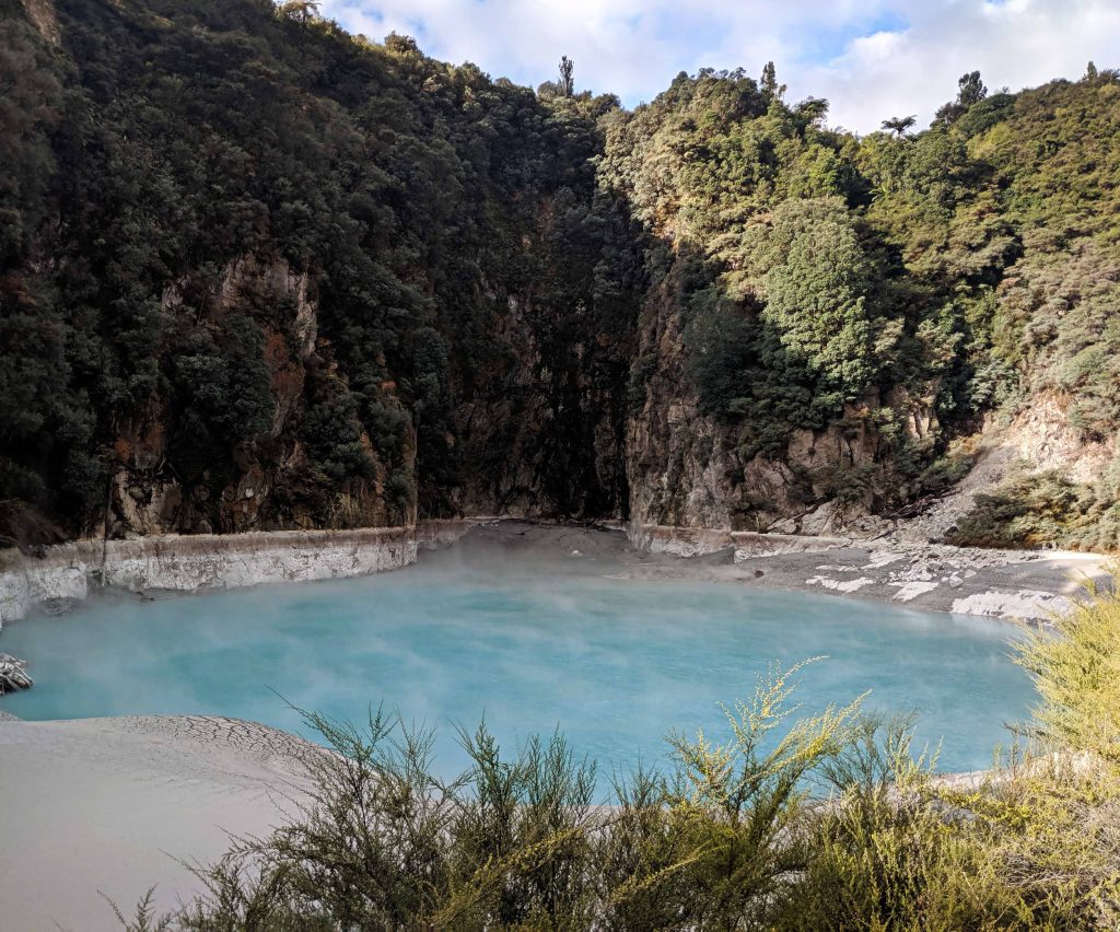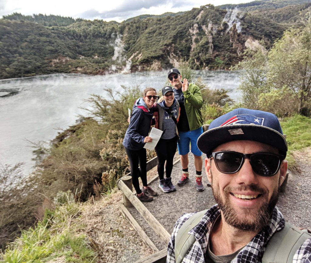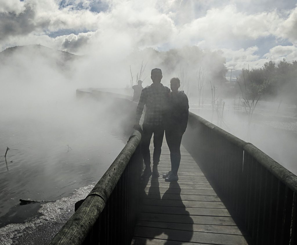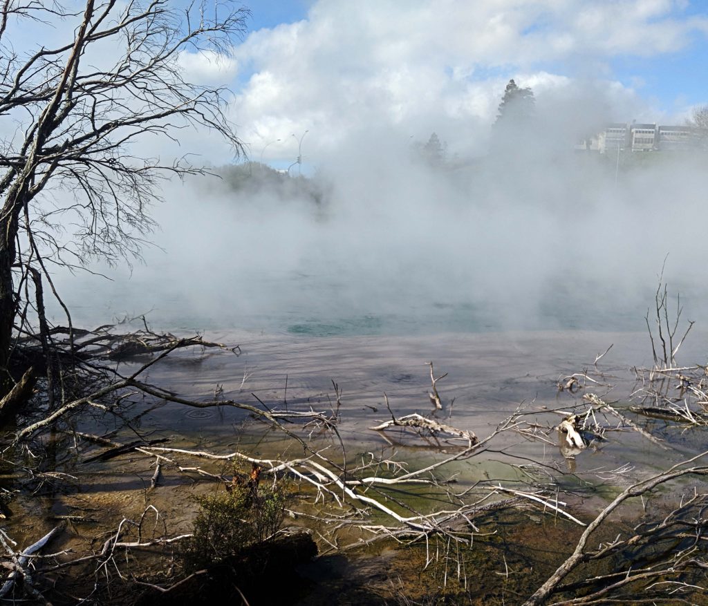 Danach trennten sich unsere Wege erstmal für die Suche eines geeigneten Nachtquartiers bevor wir uns am nächsten Tag ein paar Kilometer weiter südlich in Rotorua wieder trafen. Auch hier gibt es etwas Heißes zu entdecken: Den Kuirau Park. Heiß deshalb, weil es auch hier heiße Quellen gibt und dadurch blubbernde Pools entstehen – teils dampfend, teils matschig, teils auch sehr muffig. Aber auf jeden Fall ein Erlebnis! Und das ganze „for free“ inmitten der Stadt. Man muss also keine teure Tour durch andere geothermale Parks buchen, die ebenfalls angeboten werden.