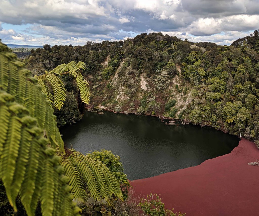Ganz um die bezahlten Attraktionen kamen wir an dem Tag aber doch nicht herum und entschieden uns noch zur Waimangu Volcanic Valley zu fahren. Dort brachen am Ende des 19. Jahrhunderts über 20 Krater des Vulkans Mount Tarawera gleichzeitig aus, sodass an der Stelle, wo vorher noch ganze Dörfer standen, nur noch ein 100 Meter tiefer Krater übrigblieb. Heute ist das Vulkan-Tal das jüngste Thermalgebiet der Welt und definitiv einen Besuch wert. Der angelegte Weg durch das Tal führte uns vorbei am rötlichen Southern Crater (die rote Farbe ist nicht, wie wir erst dachten, das Ufer, sondern Farn auf der Wasseroberfläche), am blubbernden Frying Pan Lake – oder auch Flying Pan Cake wie Kaisa ihn unabsichtlich nannte 😀 , am türkisblauen Inferno Crater bis hin zu den Warbrick Terraces. Da der Park leider schon um 17 Uhr schloss, mussten wir uns etwas beeilen und den Shuttle Bus zurück zum Eingang nehmen. Dennoch waren die Eindrücke und die vielen unterschiedlichen Farben in dem Vulkan-Tal ein einmaliges Naturerlebnis.