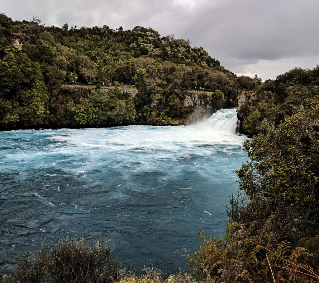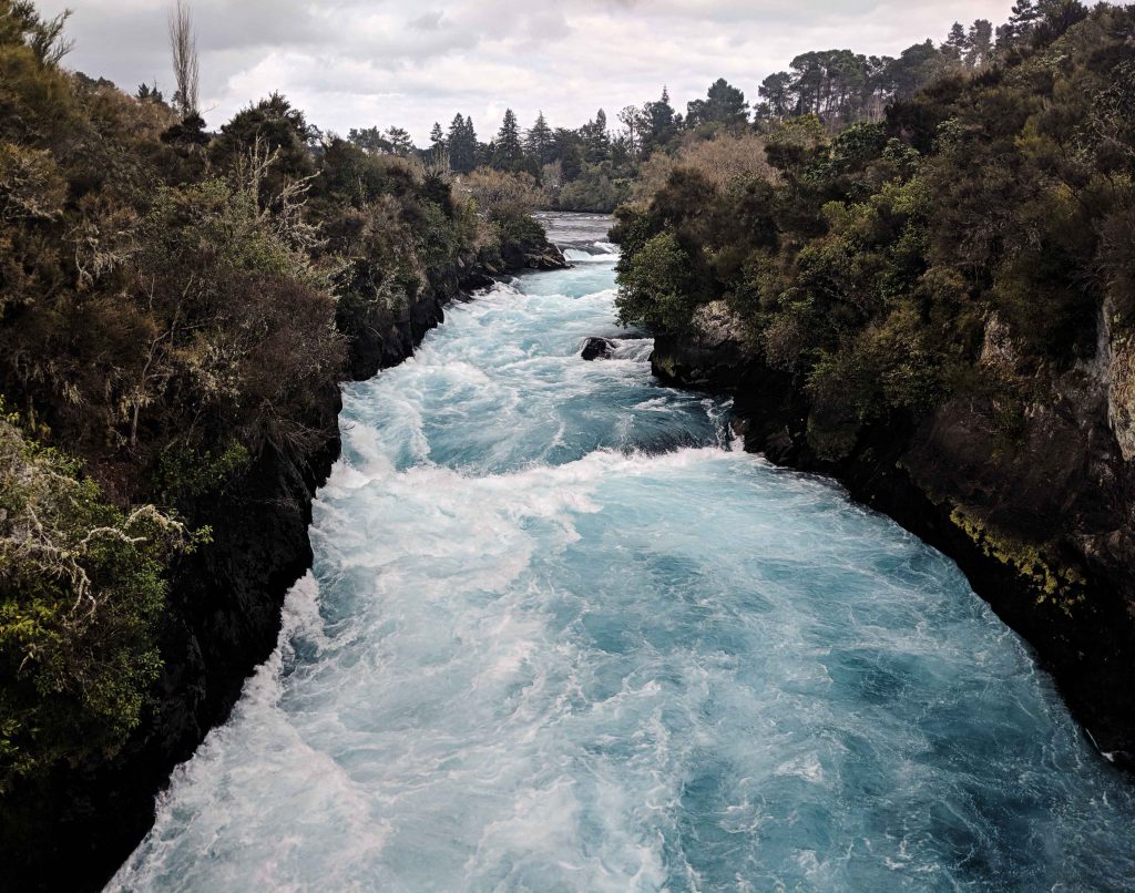 Nach einer Nacht inmitten eines Waldes, wo es sogar kostenlose heiße Duschen gab (eine Kleinigkeit, über die man sich beim Reisen sehr freut) ging es für uns weiter nach Taupo. Dort trafen wir uns wieder mit Kaisa und Jaako. Wir schlenderten erst einmal kurz über den lokalen Samstagsmarkt, auf dem sich Manuel eine dicke Wollmütze im Maori-Design kaufte, um vollständig für den neuseeländischen Winter gewappnet zu sein. Nach einer kleinen Stärkung und einer Kaffee-/Planungspause ging es dann weiter zu den berühmten Huka Falls, die wegen ihres leuchtend eisblauen Wassers ein beliebtes Fotomotiv für Postkarten sind. Vom Parkplatz aus erreichten wir diese in (ungelogen) 10 Sekunden, schossen ein paar Fotos und gingen direkt weiter – weg von den Touristenmassen – entlang des Flusses, wo das Wasser mindestens genauso schön war. Eigentlich wollten wir noch zu einem Krater laufen, aber irgendwie hatten wir den Abzweig verfehlt und beschlossen dann doch wieder umzukehren. Die Kilometer der letzten Tage steckten dann doch etwas in unseren Knochen.
