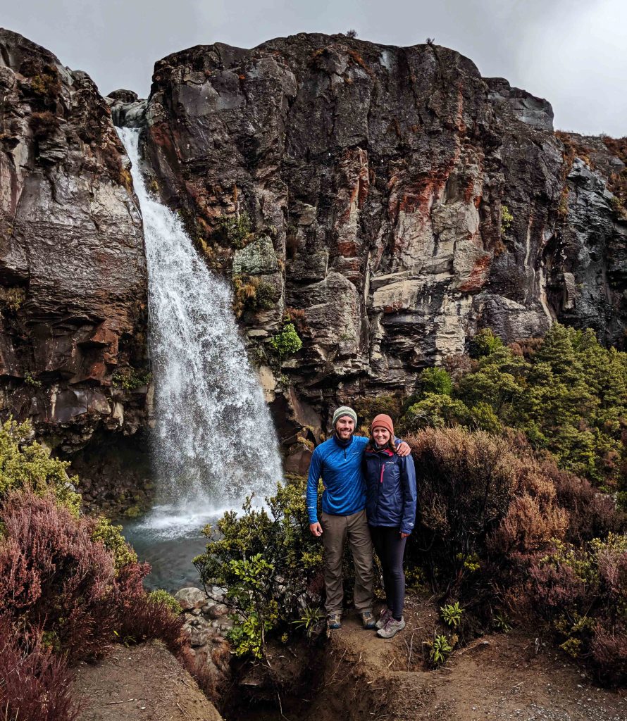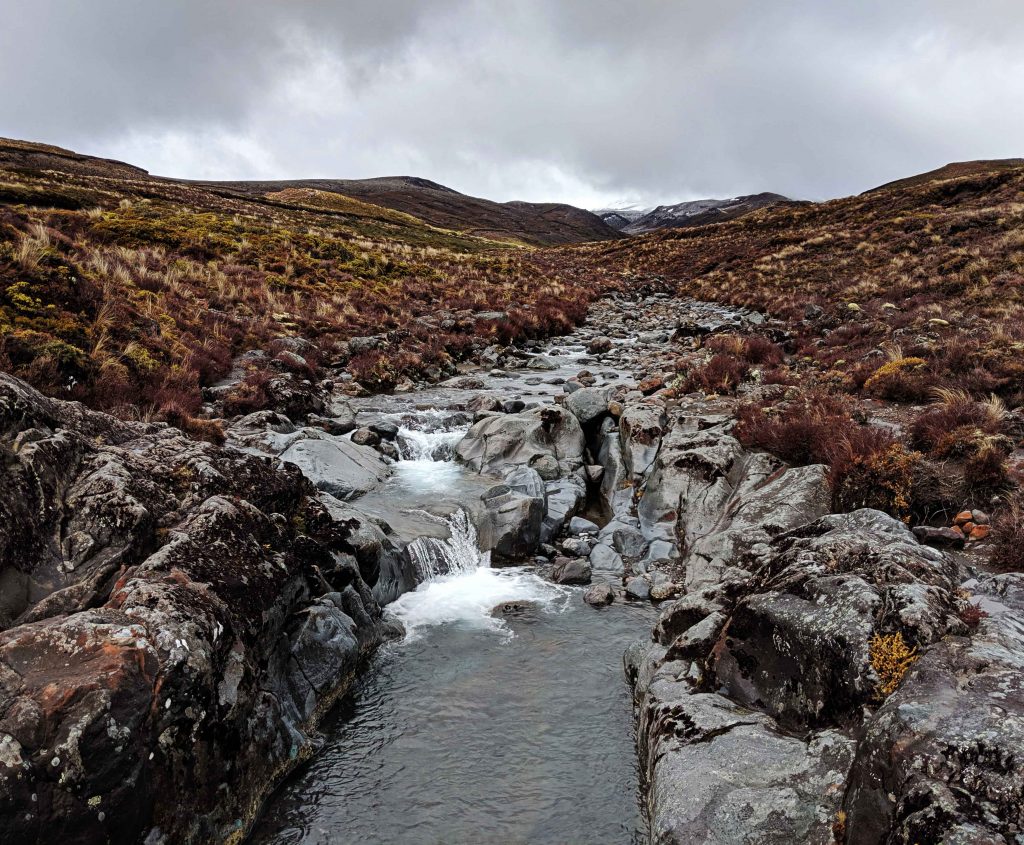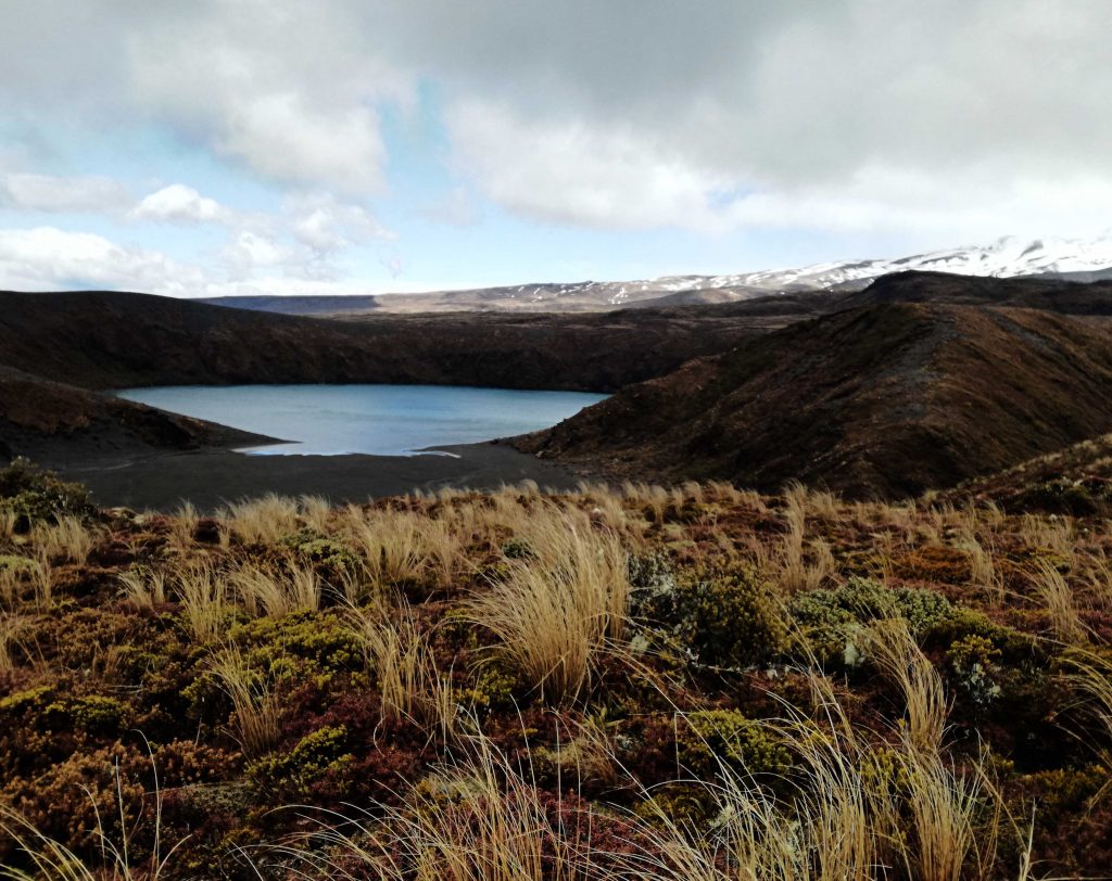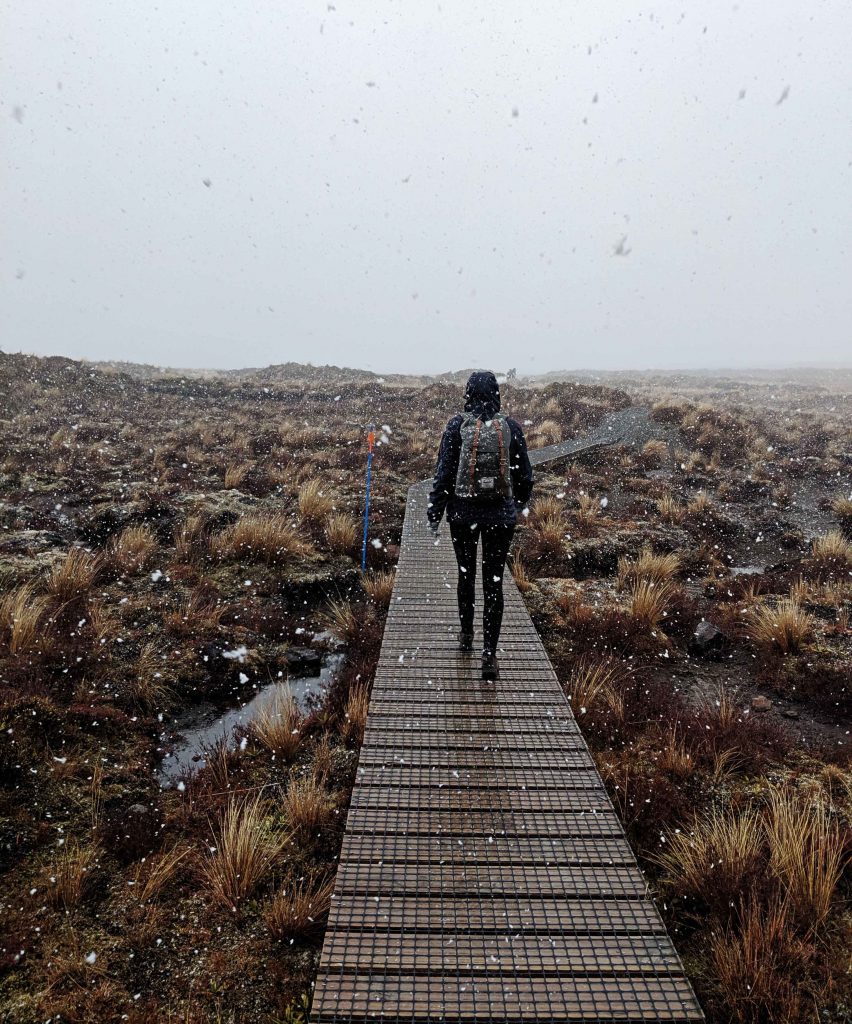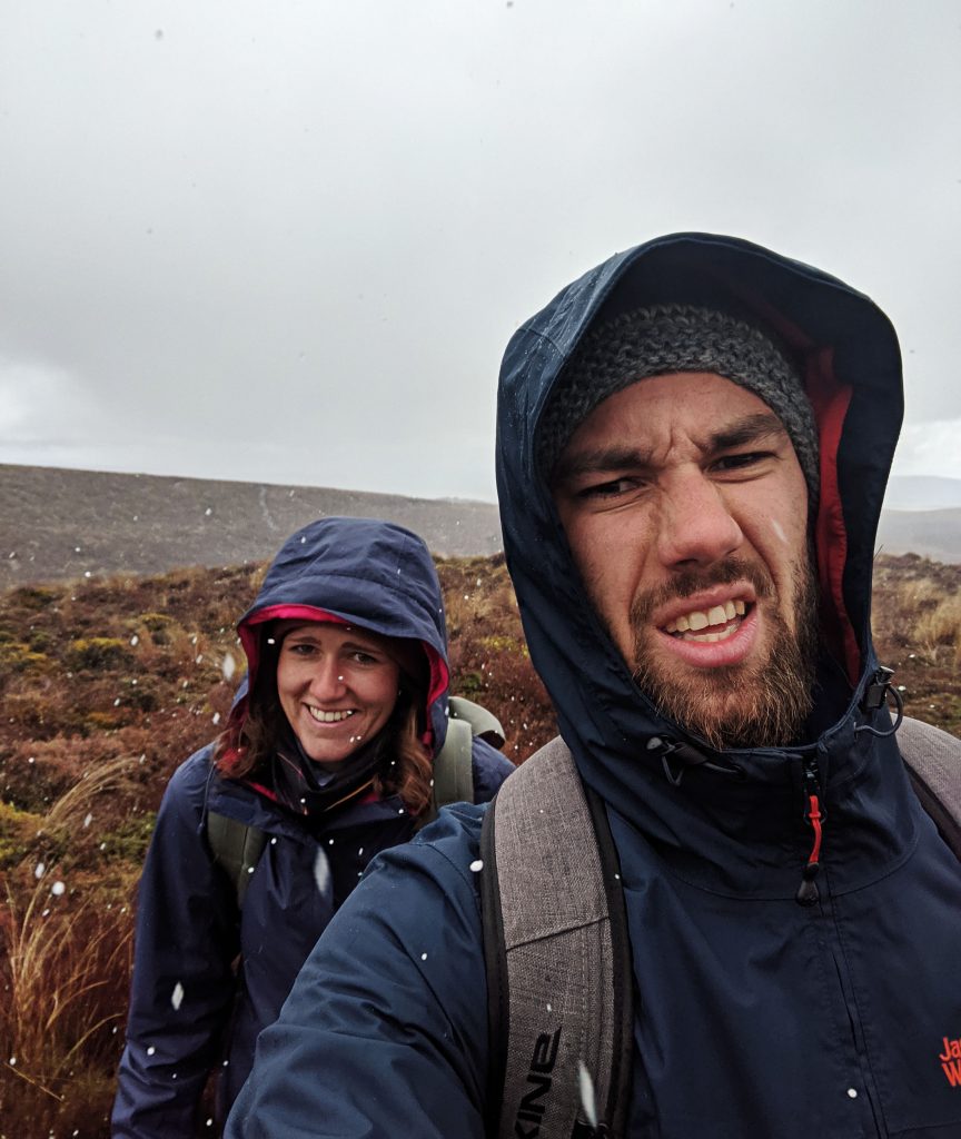 Gesagt getan! Eingepackt wie zwei Michelin-Männchen, mit Thermo-Unterwäsche, Mütze und Handschuhen ging es zwei Stunden durch eine wunderschöne Landschaft mit Blick auf die Berge bis hin zu den Taranaki Falls. Immer wieder blieben wir stehen, bestaunten die Natur und waren einfach glücklich, diesen einzigarten Fleck auf der Erde sehen zu können. Voller Euphorie und Glücksgefühle kehrten wir natürlich nicht um, sondern wanderten weiter, auch wenn die Sicht schlechter und die Temperaturen (noch) niedriger wurden. Wieder ging es durch eine farbenfrohe Buschlandschaft, über eiskalte Bergbäche hinweg hoch zu den Tama Lakes. Auf dem Weg dorthin bekamen wir dann das ultimative Winter-Feeling, als plötzlich ein kleiner Schneesturm aufzog. Für uns kam der Wind zum Glück von hinten, sodass wir nur schneebedeckt waren. Die Leute, die uns entgegenkamen, verzogen allerdings ganz schön die Gesichter 😀 .