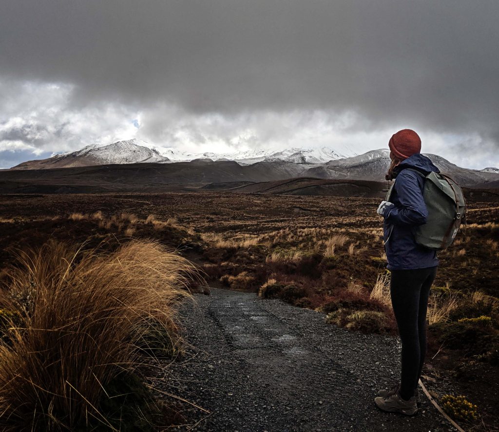 Ganz in der Nähe von Taupo liegt der Tongariro Nationalpark. Eigentlich wollten wir den wohl bekanntesten Wanderweg dort machen (Tongariro Alpine Crossing), allerdings wurde uns wegen der winterlichen Verhältnisse und unserer fehlenden Erfahrung im Schnee-/Eiswandern davon abgeraten – was wahrscheinlich auch gut so war. Trotzdem wollten wir den Park nicht unentdeckt lassen und fuhren erst einmal zur Touristeninformation, um uns über Alternativen zu informieren. Schon auf dem Weg dorthin veränderte sich die Landschaft völlig und erinnerte uns direkt an Schottland. Endlose Weiten mit orange-braunen Büschen, Nadelwälder und schneebedeckte Berge. Ein weiterer großer Unterschied zum Rest der Nordinsel: Die Kälte. Wir erreichten die Touristeninformation, sahen einige Leute in Skiklamotten und stellten erstaunt fest, dass die Temperatur auf 4°C gesunken war. Daher empfahl uns die Dame im Touristenbüro auch möglichst viel anzuziehen und erst einmal einen kürzeren Weg zu wandern, den wir je nach Wetterbedingungen dann noch verlängern könnten.