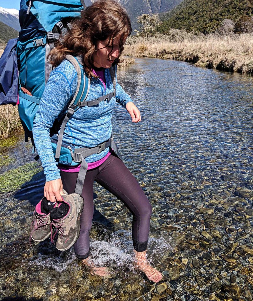Geplant hatten wir eine circa sechsstündige Etappe entlang eines Sees, hinauf auf eine Berghütte. Da auf diesem Weg allerdings ein Bach überquert werden musste, änderten sich auch unsere Pläne. Wir suchten vergeblich nach einer Möglichkeit diesen stellenweise reißenden Fluss zu überqueren. Wir zogen die Wanderschuhe aus (ich sogar die Hose), standen knietief im *piep*-kalten Wasser und mussten uns am Ende doch eingestehen: Hier kommen wir nicht rüber. Wir wussten, dass es eine Hängebrücke etwas weiter geben sollte, also stärkten wir uns noch einmal und nahmen den Umweg in Kauf. Dieser 10 km Umweg machte aus unserer geplanten entspannten Etappe ein knapp neunstündiges Abenteuer mit Höhen und Tiefen – sowohl was die Landschaft anging, als auch die Laune. Endlich am neuen Ziel – einer weiteren winzigen Hütte, lediglich am Fuße des Berges – angekommen, trafen wir dann auf Finn und Finn – einer aus Deutschland und ein Kiwi (Neuseeländer). Wir unterhielten uns über die Landschaft und die Tierwelt Neuseelands und tauschten Reisegeschichten am Kaminfeuer aus, bevor wir hundemüde versuchten Schlaf zu finden. Die Nacht war leider wenig erholsam, weil wir nur einen dünnen Schlafsack dabei hatten und es ziemlich kalt wurde.