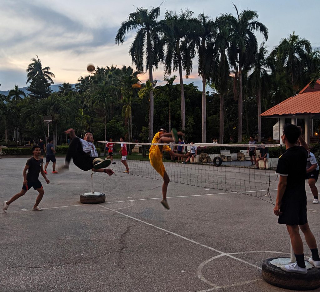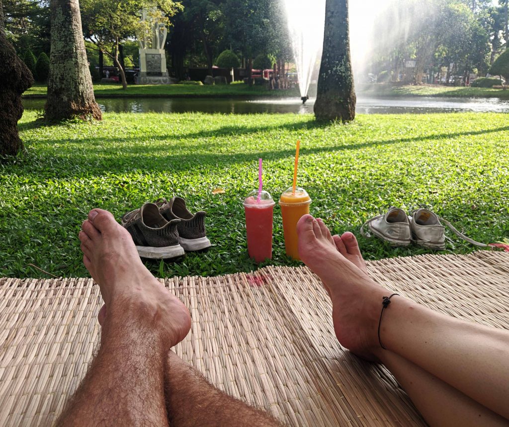 Apropos relaxen. Einen wirklich super Ort um zu lesen und zu entspannen bietet der Buak Had Park an der südwestlichen Ecke des Quadrats in Chiang Mai. Wir liehen uns einige Male eine Bambusmatte für ein paar Cent, kauften noch einen Frucht-Shake und legten uns in den Park. Wenn die Sonne untergeht, verwandelt sich dieser Park von einer „Chill-Area“ zu einer „Sport-Area“. Die Leute joggen, spielen Fußball, stretchen sich oder spielen Sepak Takraw – eine Mischung aus Volleyball und Fußball. Wir nahmen außerdem an einer gratis Yoga-Session im Park teil, welche fast jeden Tag um neun Uhr morgens stattfindet. Die erste wirkliche Yoga-Stunde in meinem Leben hat mir übrigens einen gehörigen, viertägigen Muskelkater eingehandelt 😀 .