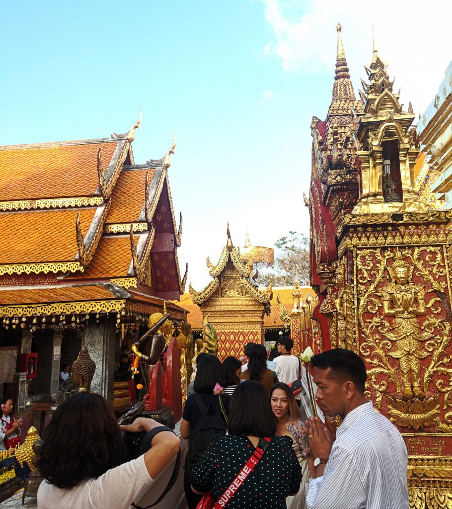 Weiter ging es zum Sonnenuntergang auf den Berg direkt neben der Stadt. Wir hatten geplant den Sonnenuntergang im Wat Phrathat Doi Suthep zu genießen – schon nach kurzer Zeit wussten wir aber schon, dass wir diesen hier nicht genießen würden. Überall Gold und Protz, zu viele Menschen. Deswegen suchten wir kurzer Hand eine Alternative und landeten an einem winzigen Viewpoint gegenüber des Königspalastes Phu Ping Palace. Der Sonnenuntergang war cool, aber das wirkliche Highlight kam erst als wir zu unserem Roller zurückkehren wollten. Eine Truppe schon etwas angeheiterter Männer winkte und rief uns zu sich. Ohne wirklich zu überlegen setzten wir uns zu ihnen auf die Plastikstühle. Natürlich wurden uns diverse hochprozentige Getränke angeboten, welche wir allerdings ablehnten, da wir noch fahren mussten. Das Witzige an der ganzen Geschichte war, dass wir super viel Spaß mit den Herren hatten, obwohl wir keine gemeinsame Sprache fanden. Tamara hat einen der Männer sogar so sehr in den Bann gezogen, dass er versuchte uns so lange wie möglich dort zu behalten. Erst lief er los und holte zwei Flaschen Wasser für uns. Dann lief er los und holte ein Six-Pack Wasser. Ganz am Ende holte er auch noch Bonbons vom Shop nebenan und bot natürlich nur Tamara diese an 😀 .