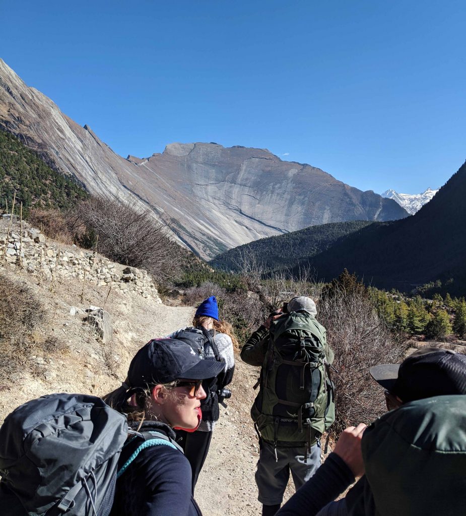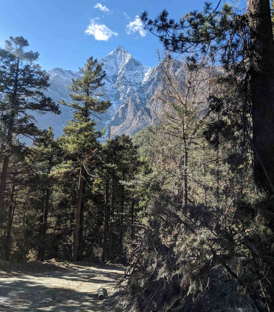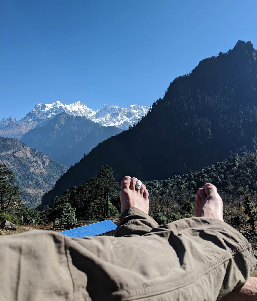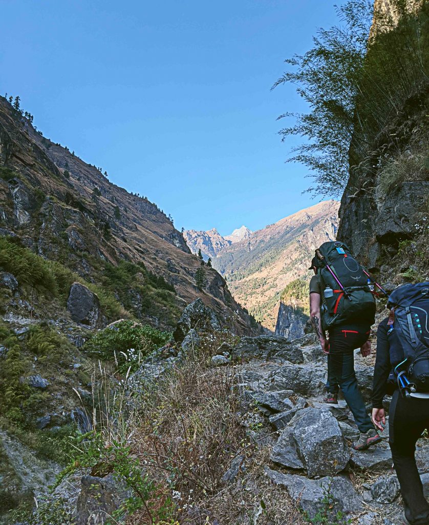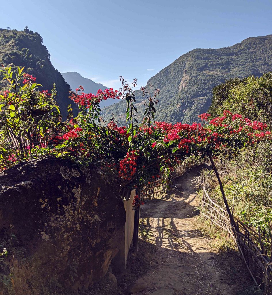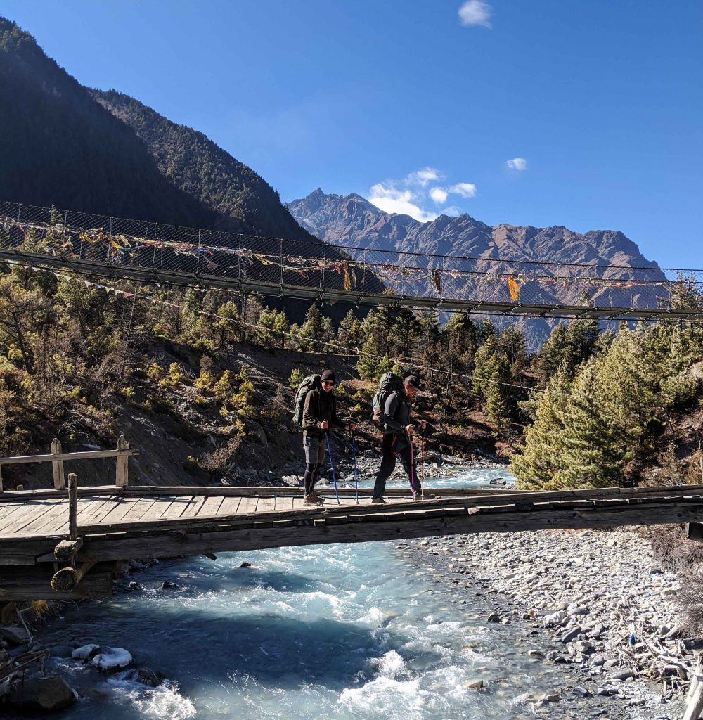 Der Weg veränderte sich fast stündlich. Von dicht bewachsenen Wäldern, immer wieder über Hängebrücken über reißende Bäche, durch kleine Bergdörfer. Immer im Blick: Die schneebedeckten Berge. An Schnee und Eis war aber jetzt noch gar nicht zu denken, denn es waren in den Anfangstagen circa 18 °C und bei dem stetig nach oben führenden Weg war nahezu jedes Shirt zu viel.