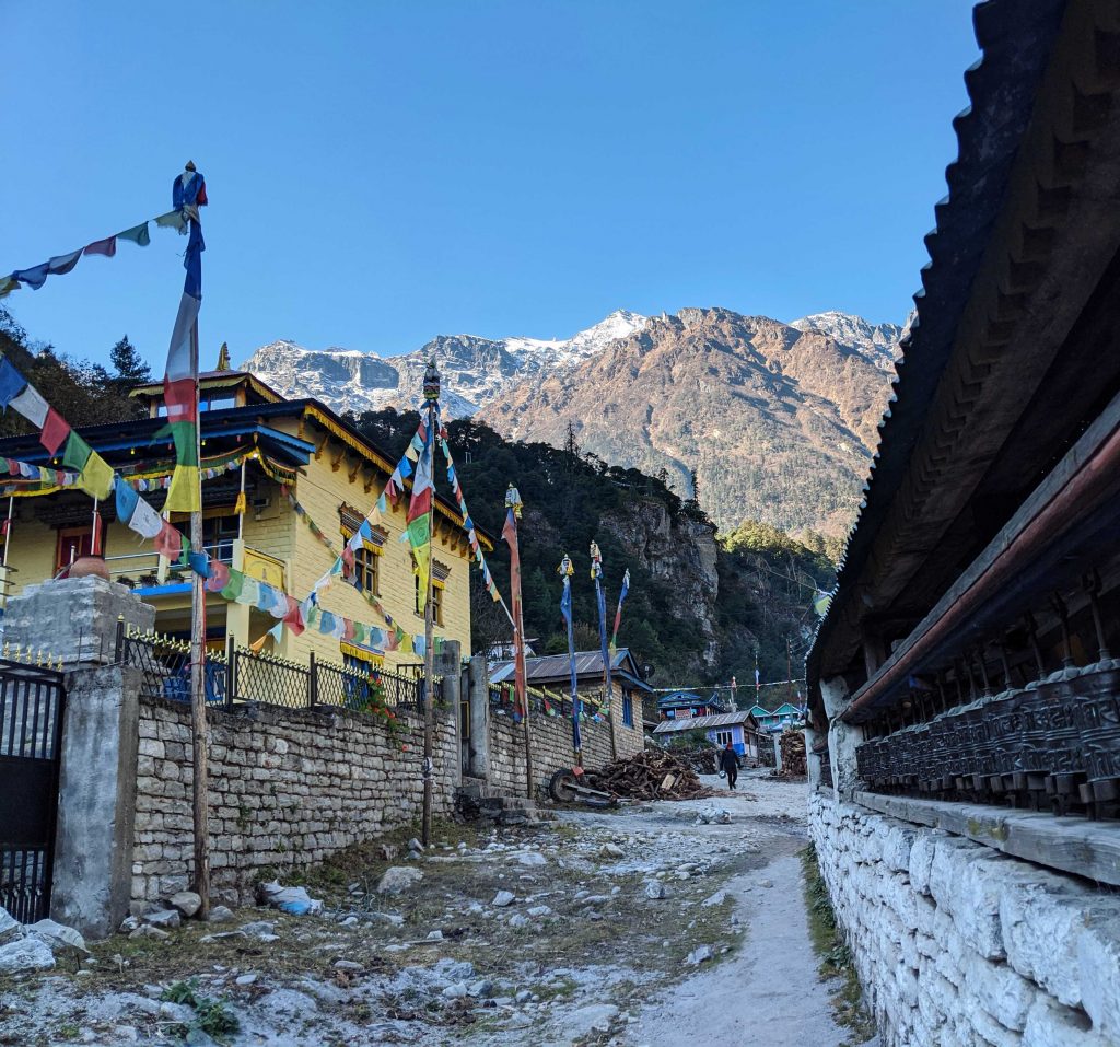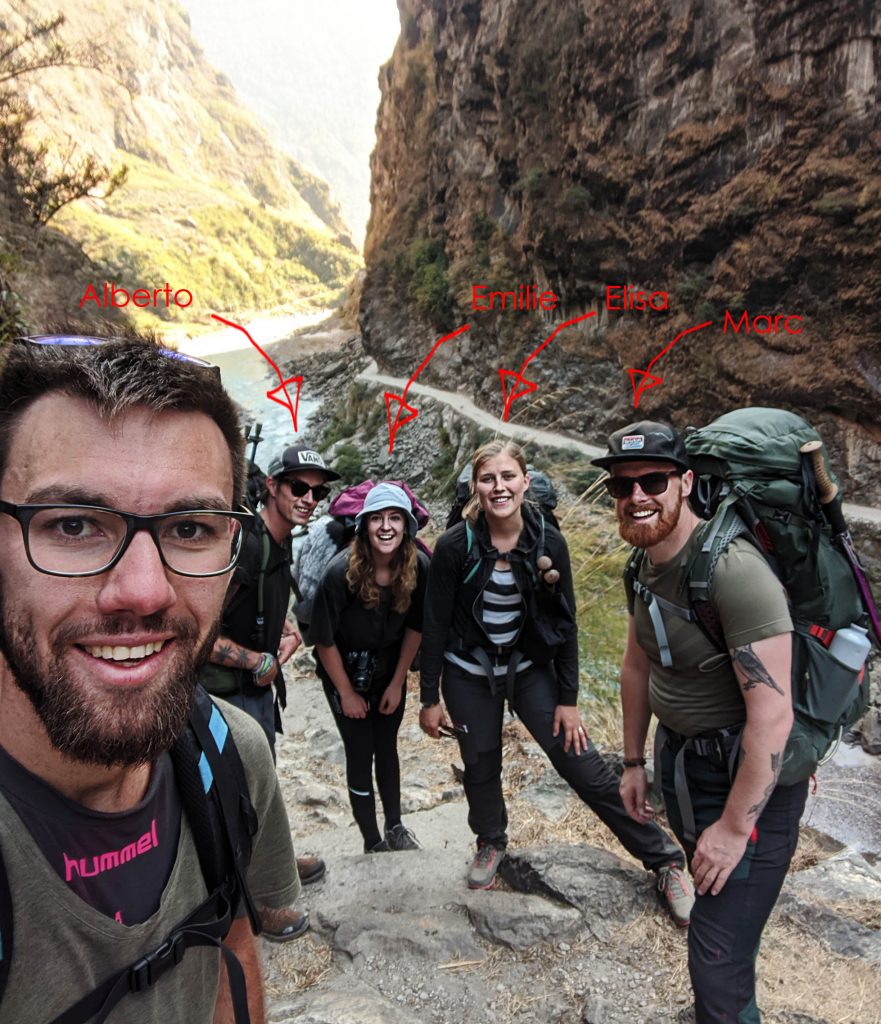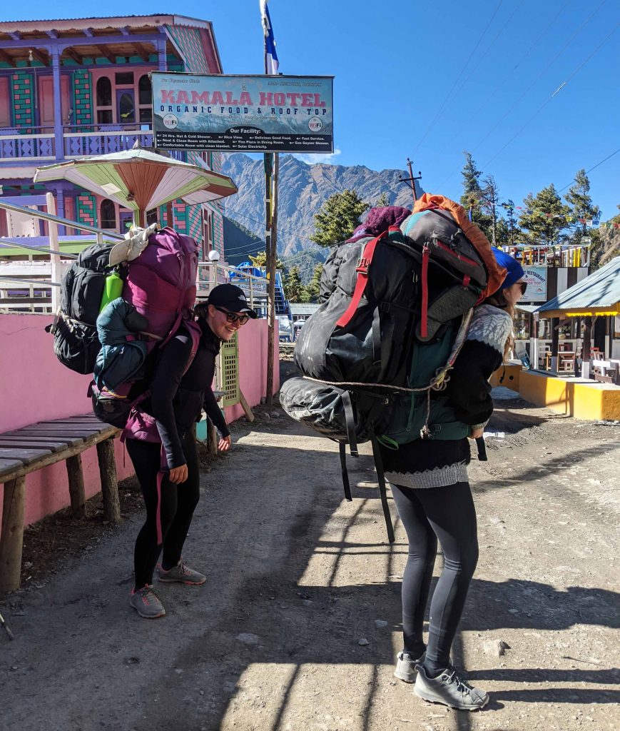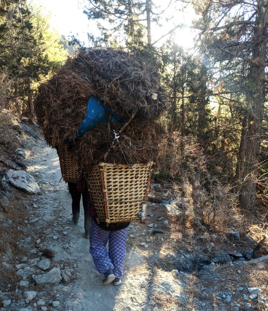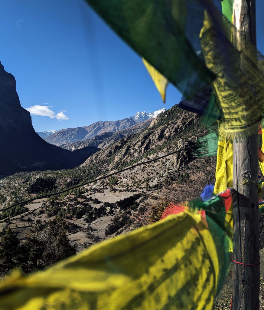 Der Weg veränderte sich fast stündlich. Von dicht bewachsenen Wäldern, immer wieder über Hängebrücken über reißende Bäche, durch kleine Bergdörfer. Immer im Blick: Die schneebedeckten Berge. An Schnee und Eis war aber jetzt noch gar nicht zu denken, denn es waren in den Anfangstagen circa 18 °C und bei dem stetig nach oben führenden Weg war nahezu jedes Shirt zu viel.
