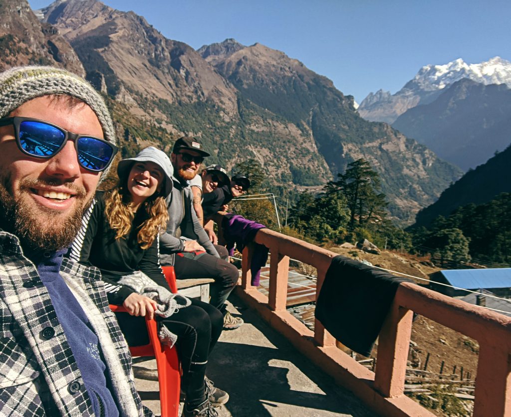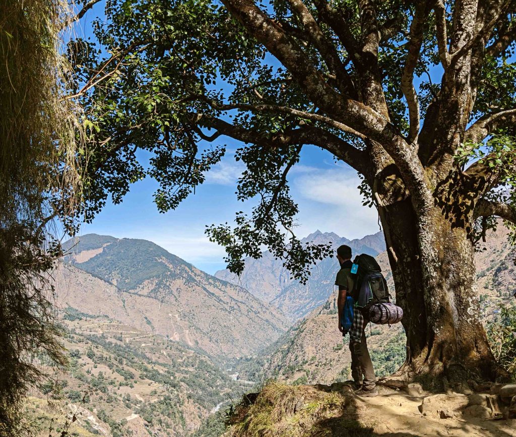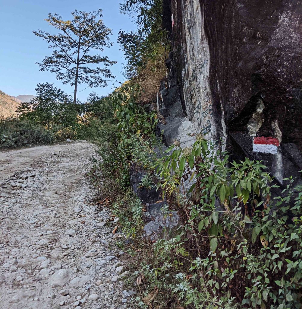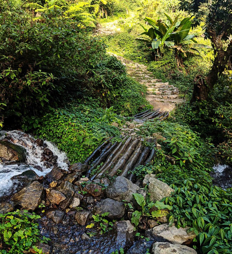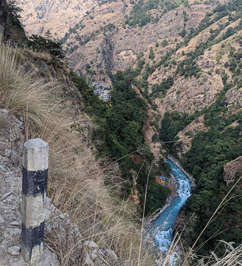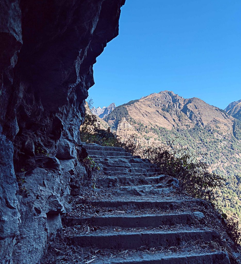 Der Weg veränderte sich fast stündlich. Von dicht bewachsenen Wäldern, immer wieder über Hängebrücken über reißende Bäche, durch kleine Bergdörfer. Immer im Blick: Die schneebedeckten Berge. An Schnee und Eis war aber jetzt noch gar nicht zu denken, denn es waren in den Anfangstagen circa 18 °C und bei dem stetig nach oben führenden Weg war nahezu jedes Shirt zu viel.