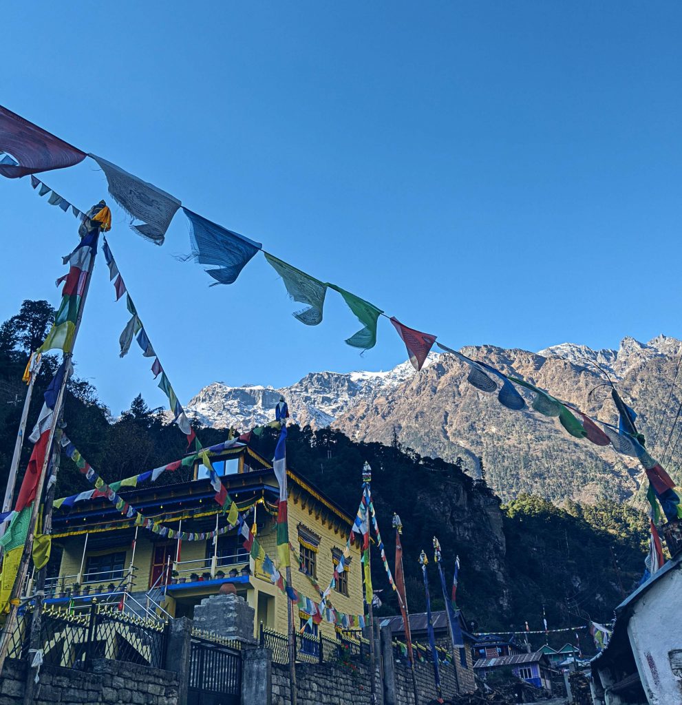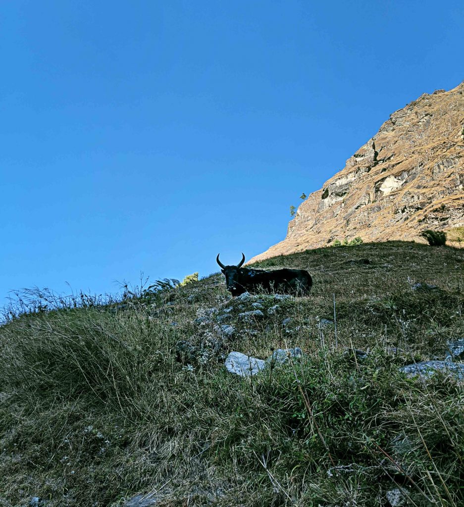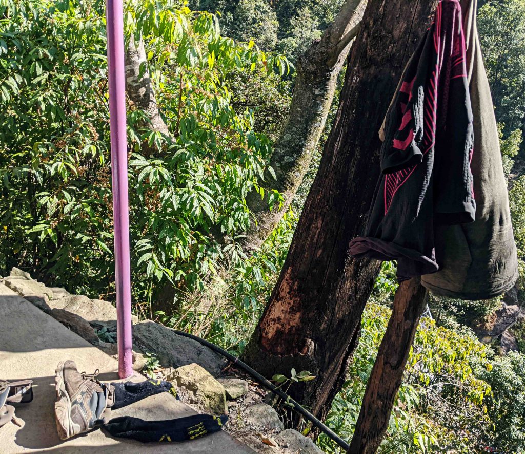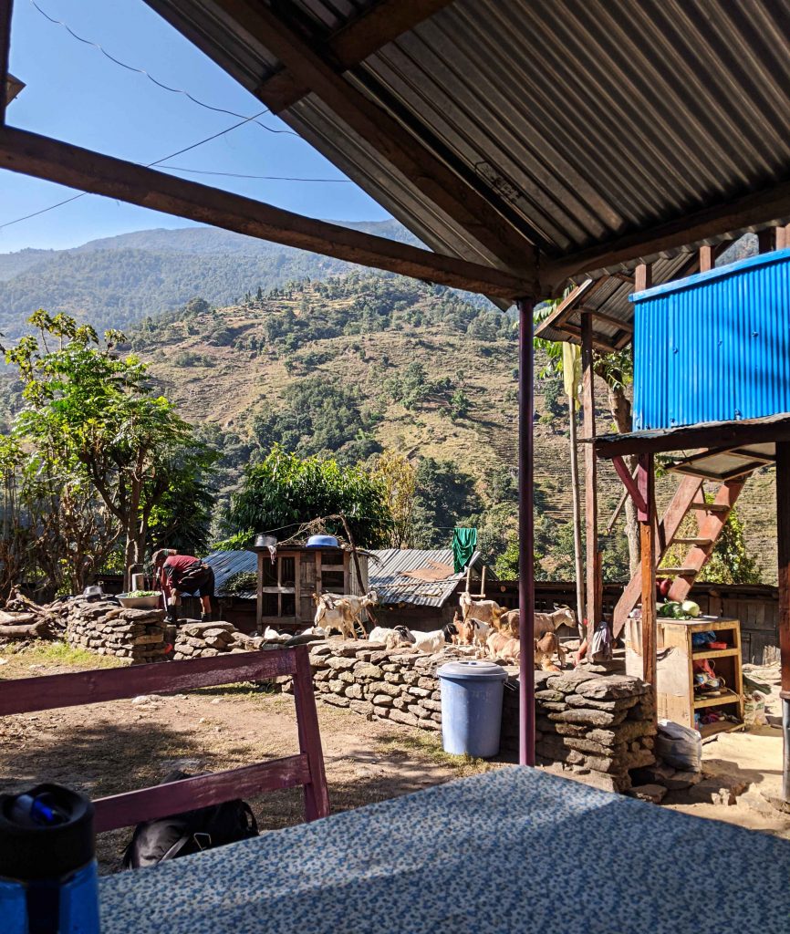 Um circa acht Uhr ging es für mich also los. Vorbei an freundlichen Menschen, die immer für einen kurzen Plausch gut waren, immer auf die schneebedeckten Berge zu. Ich wollte den Annapurna Circuit zunächst alleine bewandern und es fühlte sich nach der richtigen Entscheidung an. Ich genoss mein Mittagessen mit zwei kleinen Hunden an einer kleinen Hütte. Die Bewohner waren so ziemlich das, was man Selbstversorger nennen kann. Ziegen hier, Kühe da. Ich zog meine (durchgeschwitzten) Socken und Klamotten aus und hing sie zum Trocknen auf. Ein Ritual, dass ich ab hier jeden Mittag durchführen würde.