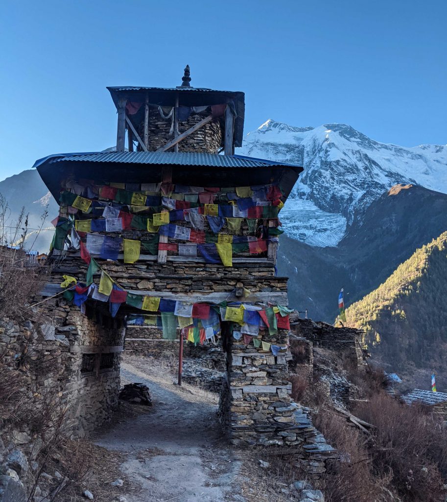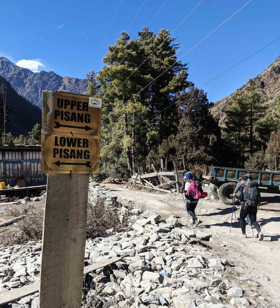 Es tat gut Menschen um sicher herum zu haben, die auf ähnlichem Fitness-Level und vor allem auf der gleichen Wellenlänge sind. Auch wenn wir nach einem anstrengenden Wandertag abends immer ziemlich müde waren, unterhielten wir uns bei immer kälter werdenen Nächten über Gott und die Welt. Nacht drei verbrachten wir so in Dharapani auf 1862 m. Nacht vier dann in Chame auf 2670 m, und Nacht Nummer fünf in Upper Pisang auf 3302 m. Gerade diese letzte Etappe von Chame nach Upper Pisang hatte es in sich: Auf kürzester Distanz musste eine Rampe von knapp 300 Höhenmetern überwunden werden. Ein (für Außenstehende) witziger Anblick: Jeder schlich in seinem eigenen Tempo, mit motivierender Musik auf den Hörern, in Abständen von circa 50 m hinter dem andern her und versuchte es irgendwie nach oben zu schaffen. Hatten wir gefühlt 20 Höhenmeter geschaffte musste erstmal durchgeschnauft werden.