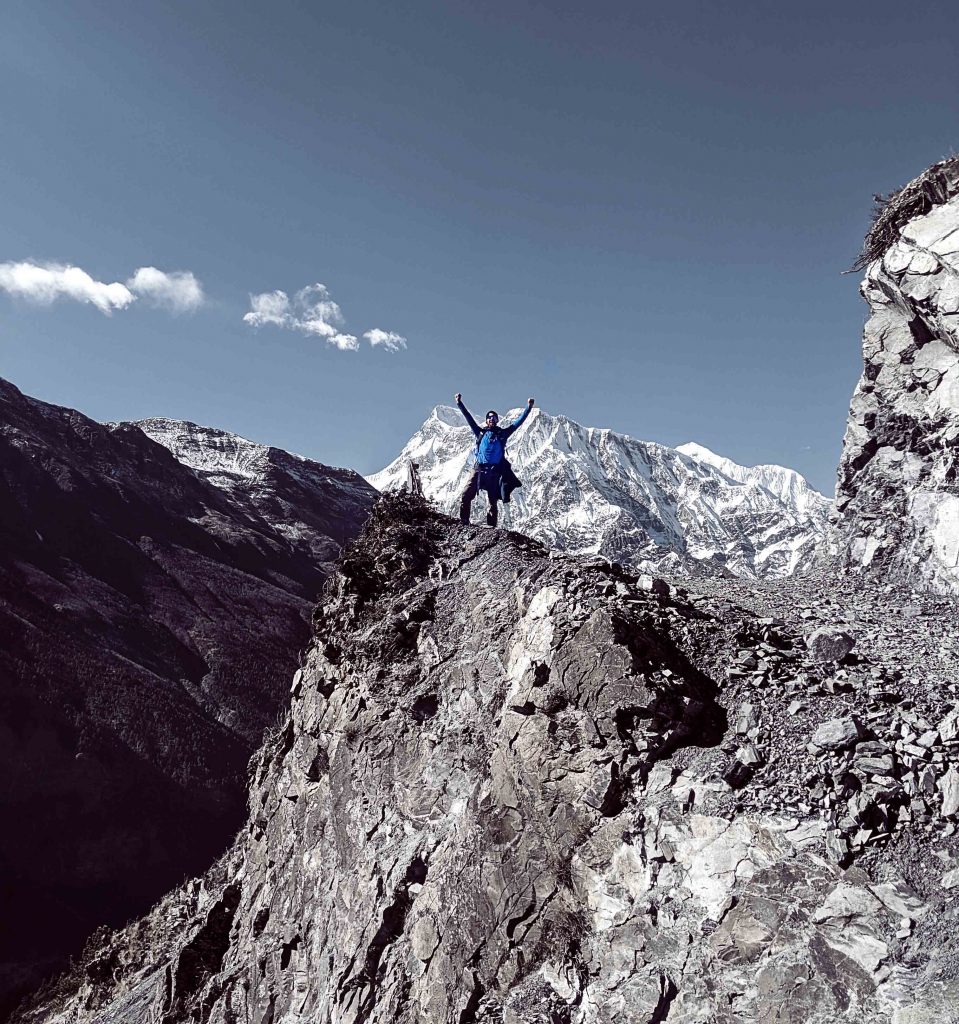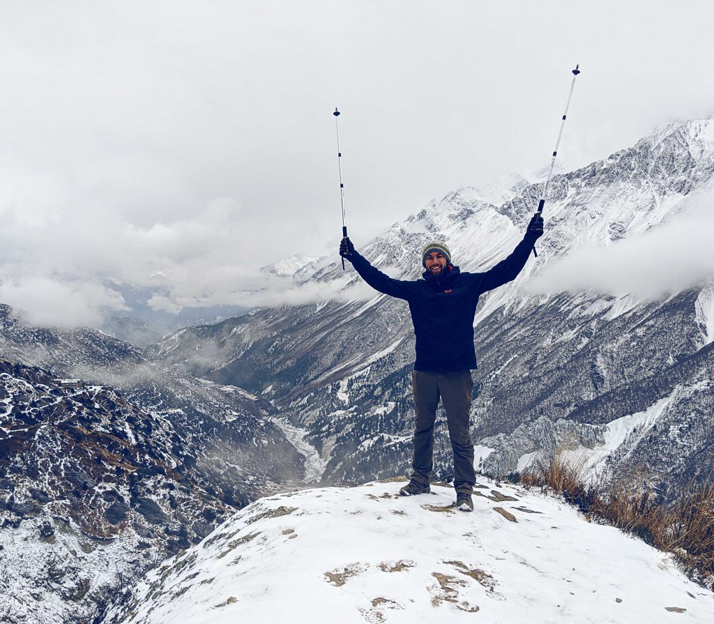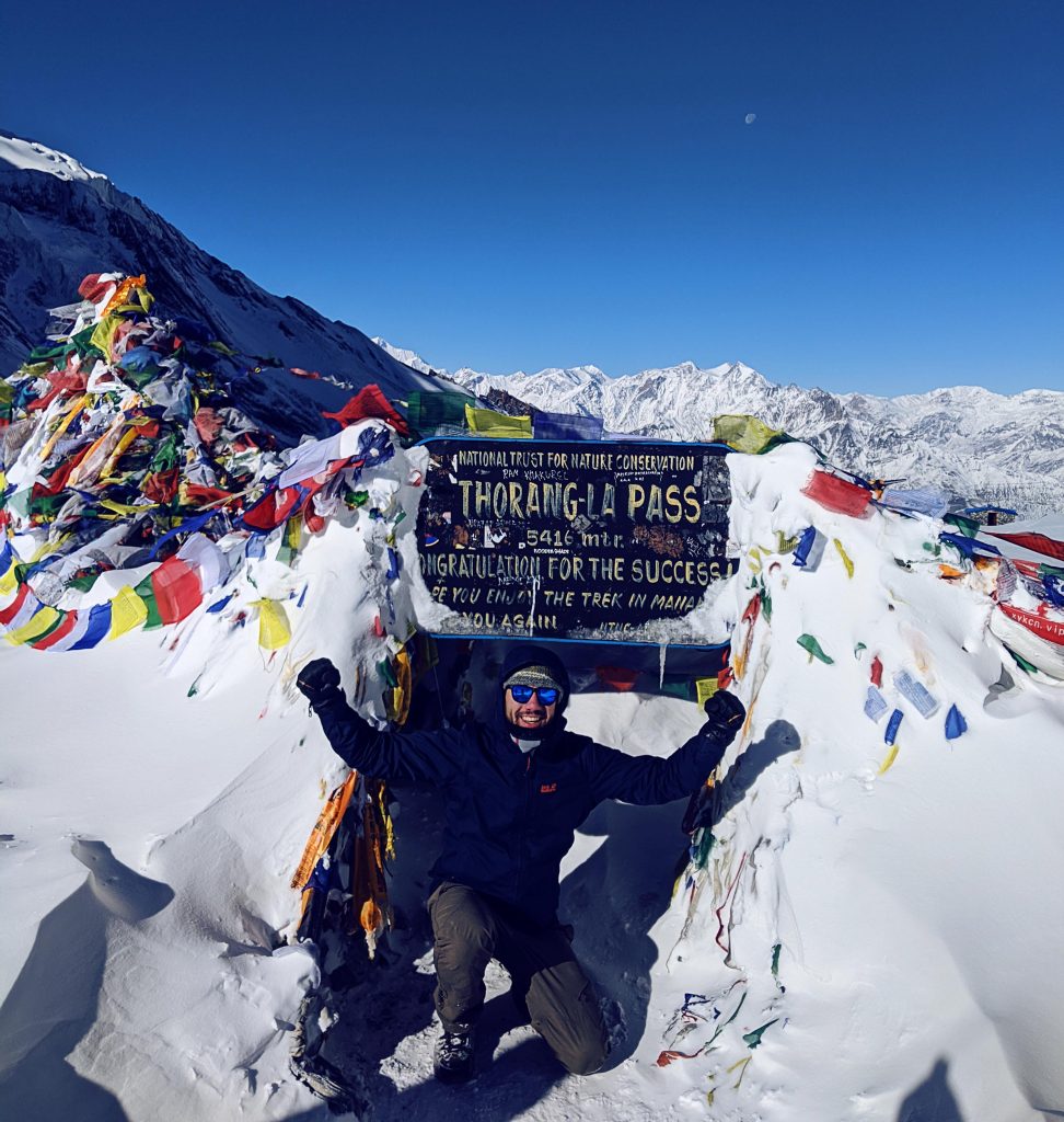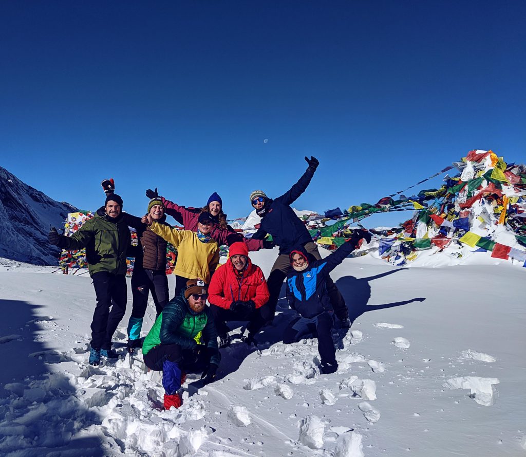 Nachdem wir einige Stunden alleine voraus gegangen waren, erreichten wir den Thorong La – den Pass. Wie aus dem Nichts machte sich eine unbändige Freude in uns breit und wir vielen jedem aus unserer Gruppe in die Arme. Wir posierten natürlich für das ein oder andere Bild und konnten aber eigentlich gar nicht wirklich glauben, dass wir es bis hierher geschafft hatten. Wir konnten ebenfalls nicht glauben, dass es von nun an nur noch bergab gehen würde. Wir waren auf 5416m angekommen!