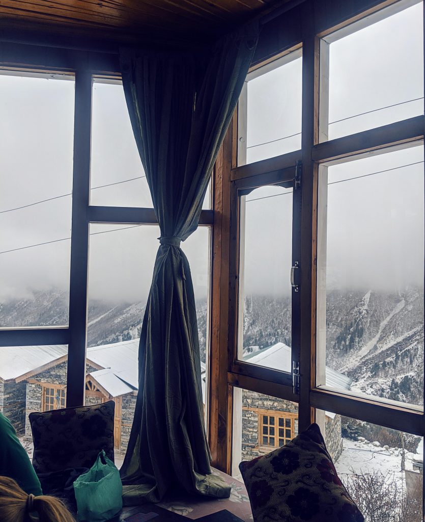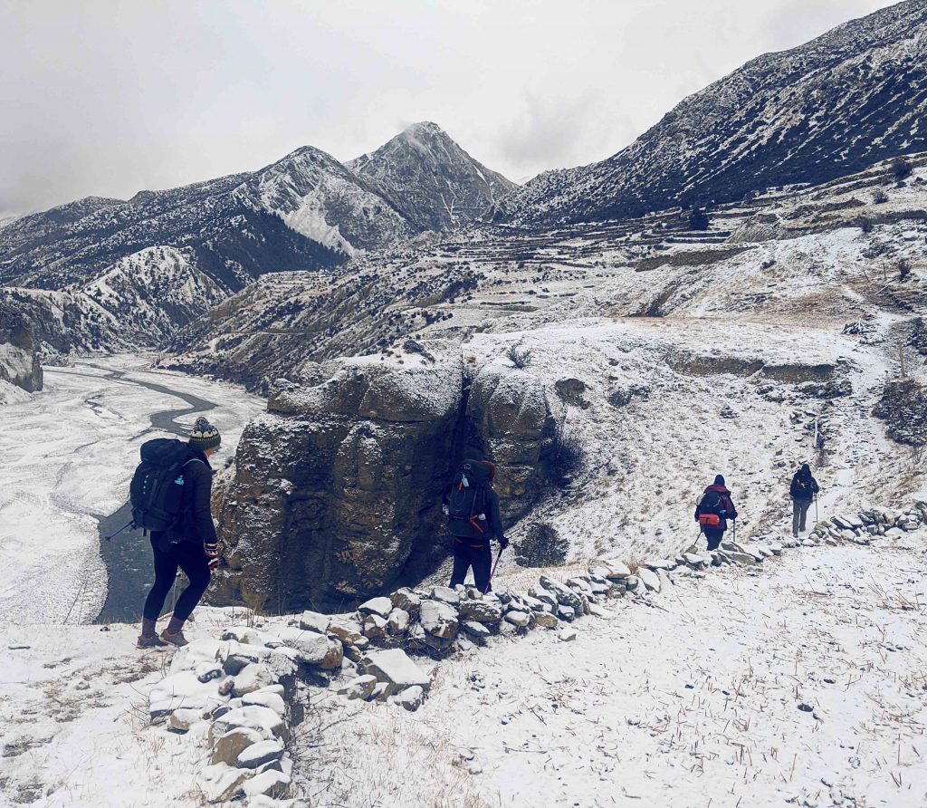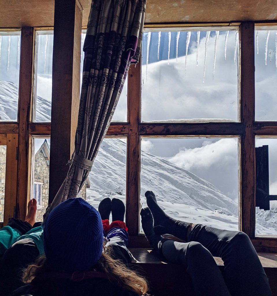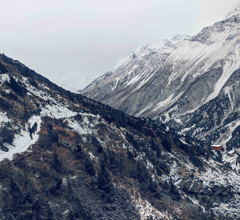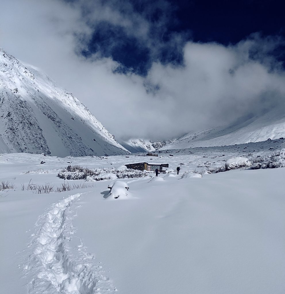 Wir trafen auf dem Weg hinunter in einem kleinen Dorf auf ein paar Einheimische, welche uns eine Geschichte von einigen Wanderern vom Vortag erzählten. Sie hätten erzählt, dass sie in einen Schneesturm geraten waren und vier Stunden in einer Nothütte warten mussten. Sie verbrannten Plastikreste aus ihren Taschen um sich zu wärmen, bevor sie weiterwandern konnten. Als wir das hörten, waren wir natürlich besorgt um unsere neu gewonnenen Freunde, welche sich schon einen Tag früher aufgemacht hatten. Aber wir waren auch etwas erleichtert, dass wir entschlossen hatten noch einen Tag mehr zu warten. Wie sich später herausstellte, ging es aber allen Beteiligten gut.