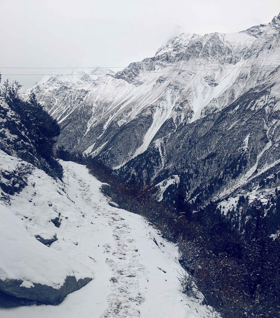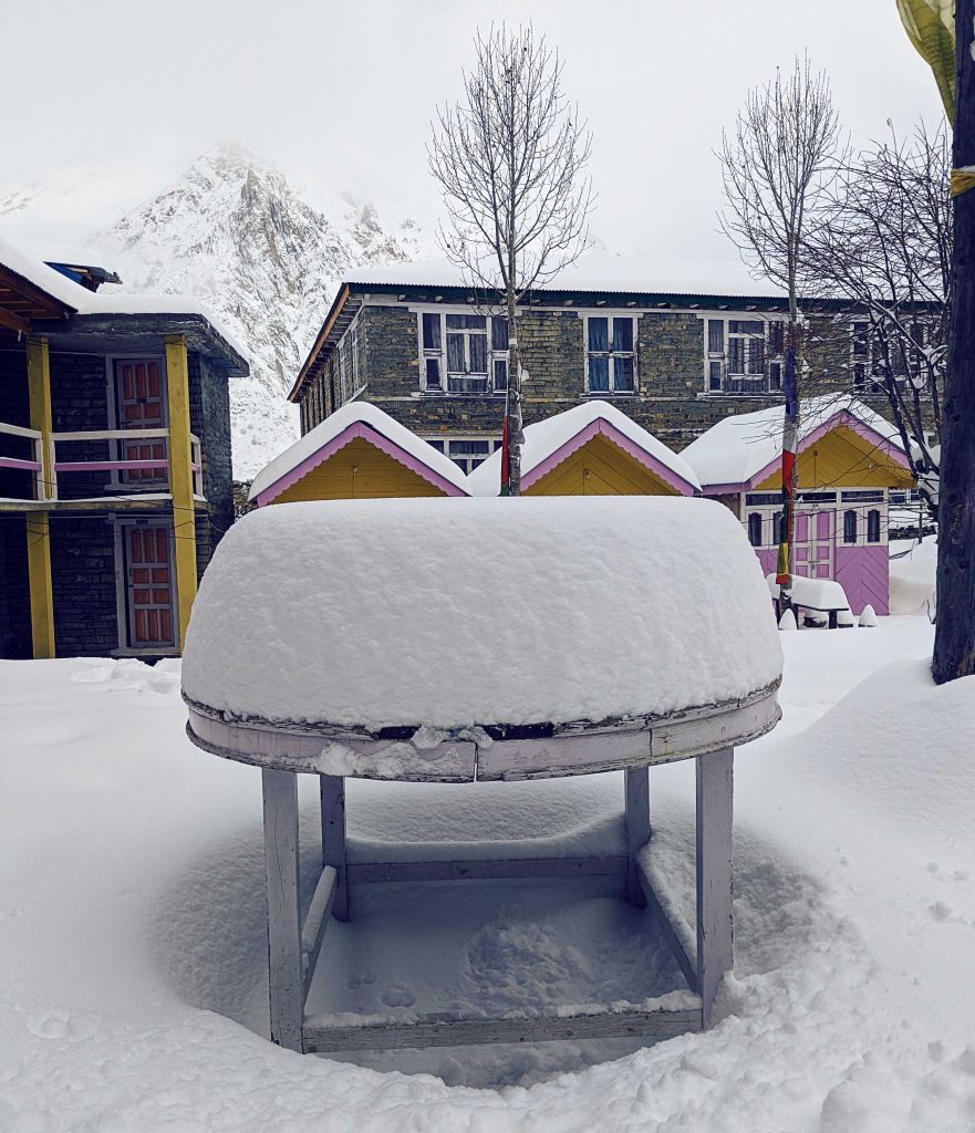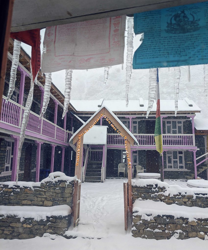 Wir wollten an diesem Tag eigentlich einen Umweg in Richtung Tilicho Lake machen – dem vermeintlich höchst gelegenen See der Welt. Man erzählte uns, dass die Russen hier schon vor langer Zeit ihre Kampftaucher unter widrigen Bedingungen trainiert hatten. Nachdem wir ein kleines Dorf namens Shreekharka erreichten, trafen wir auf zwei Australier mit Guide, welche wir schon die Tage zuvor einmal beim Mittagessen getroffen hatten. Sie kamen gerade vom Tilicho Lake, mussten aber vorher umdrehen und sagten uns, dass es zu gefährlich sei, bei dem vorherrschenden Wetter zum See zu gehen. Auch wenn man es schaffen würde, hätte man wegen starken Nebels nicht die Möglichkeit, irgendetwas vom See zu erkennen. Na Klasse! Wir beschlossen nach einigen Diskussionen, die Nacht im Dorf zu verbringen und am nächsten Tag weiter in Richtung Pass zu wandern. Leider versprach der Wetterbericht auch für die nächsten Tage keine Besserung.