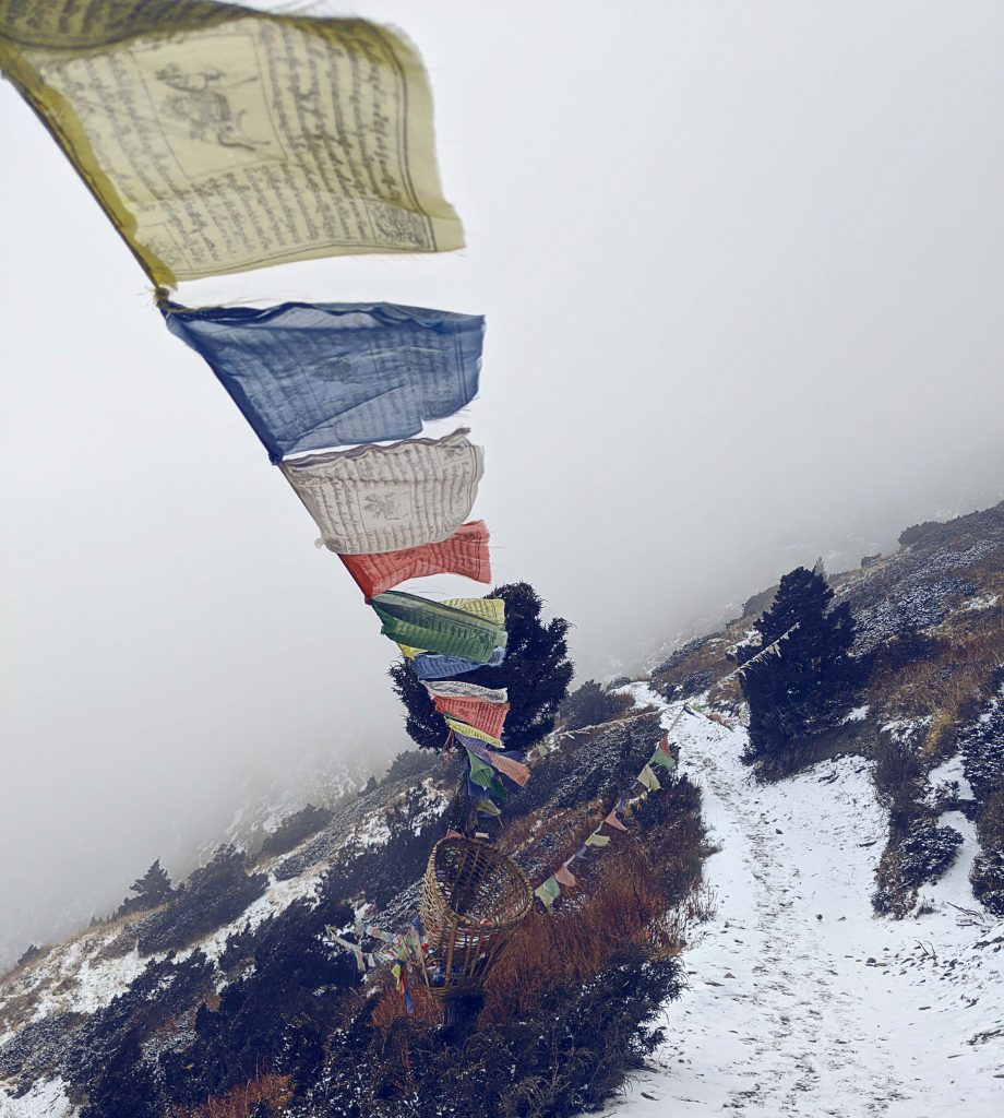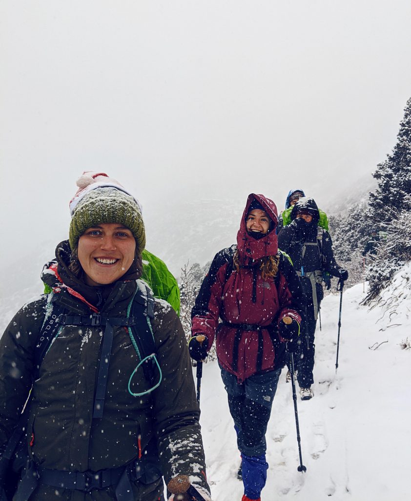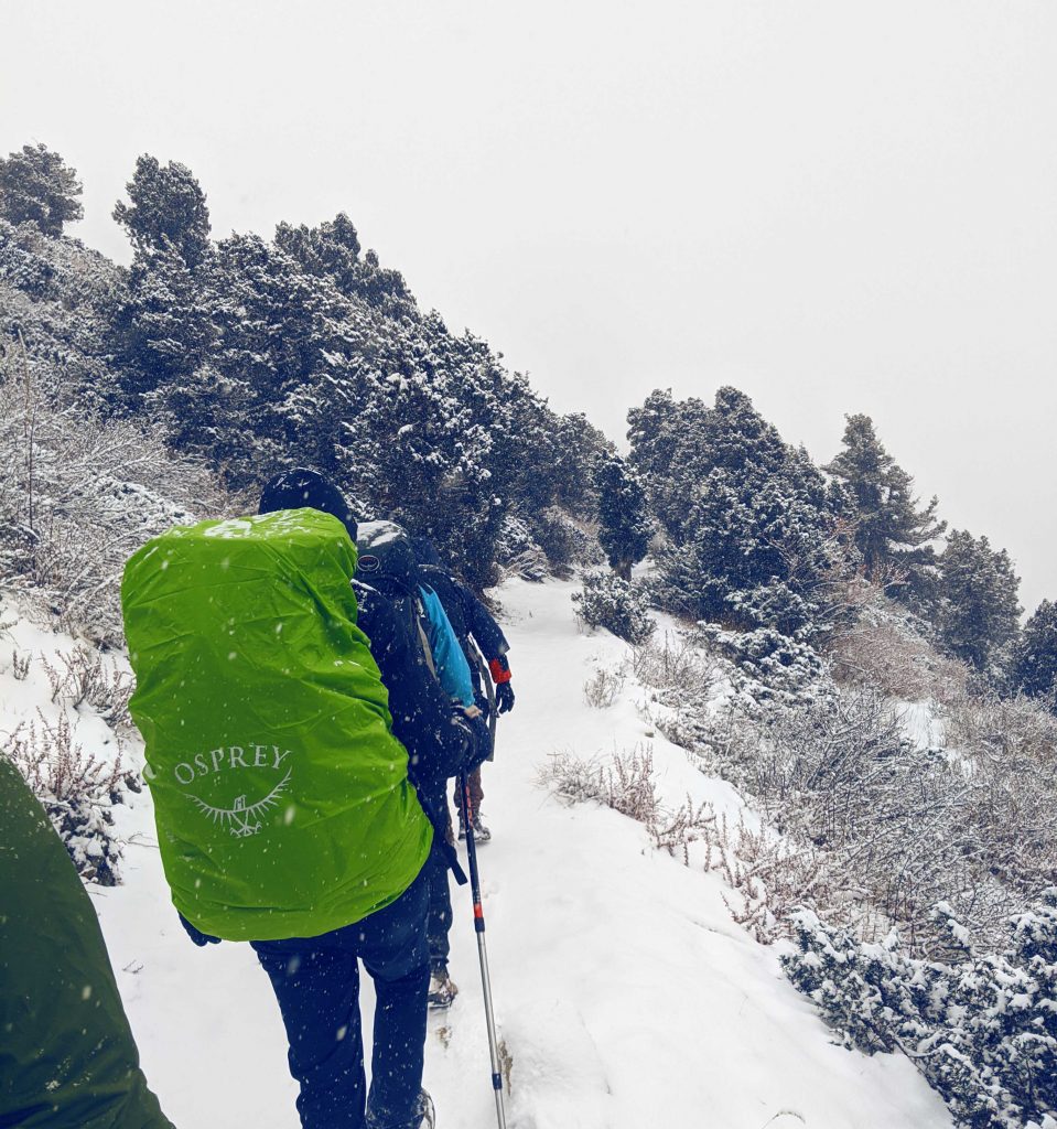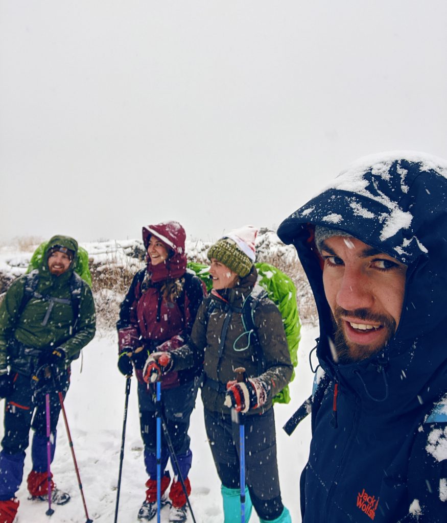 Der nächste Tag war vor allem kalt und nass. Es machte aber irgendwie Laune ohne Steigeisen (auf die hatte ich verzichtet) die steilen, schneebedeckten Wege hoch zu laufen – und vor allem runter zu sliden. Ein Problem bei dieser Kälte war vor allem, dass mein Wasser in meinem Lifestraw gefror und ich viel zu wenig trank. Ich hatte abends starke Kopfschmerzen, war mir aber ziemlich sicher, dass es nicht die Höhe sein konnte, da ich nur ca. 500 ml Wasser den Tag über getrunken hatte – bei empfohlenen 4-5 Litern pro Tag.