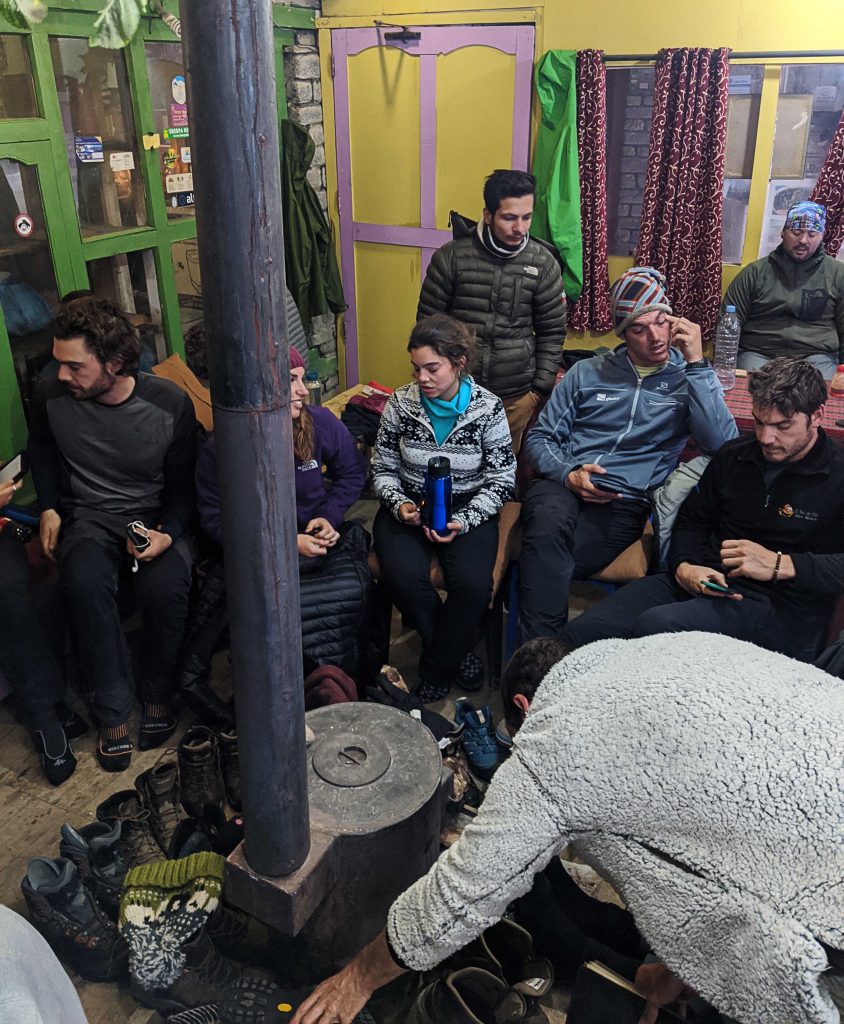 Verloren in Zeit und Raum kamen wir komplett am Ende unserer Kräfte auf 4500m in Thorong Phedi an. Jedem Einzelne der Gruppe wurde alles abverlangt und das sah man auch in den Gesichtern. Wir bezogen unsere Zimmer und wärmten uns mit der vertrauten Truppe vom Vortag am Ofen in der Gemeinschaftshütte. Die Spanier sorgten am Abend für gute Laune. Einer von Ihnen hatte eine Gitarre mitgebracht und zusammen sangen sie spanische Lieder. Nachdem wir gegessen hatten und wieder einigermaßen warm waren, war dies ein willkommener Ausklang des Tages. Zwei Guides waren sich nicht einig über das Wetter oben am Pass in den nächsten Tagen. Wir diskutierten ob es für uns sinnvoll wäre, bereits am nächsten Tag den Pass zu überqueren. Wir beschlossen am nächsten Tag lediglich bis zum relativ nahen High Camp zu wandern und am darauf folgenden Tag den Pass zu überqueren. Einige andere waren unter Zeitdruck, hatten einen Flug von Jomsom gebucht und waren darauf angewiesen, schon am nächsten Tag den Pass zu überqueren. In der Nacht hatte ich glaube ich die beste Nacht in diesen Höhenlagen – kein Wunder bei der Anstrengung dieses Tages.
