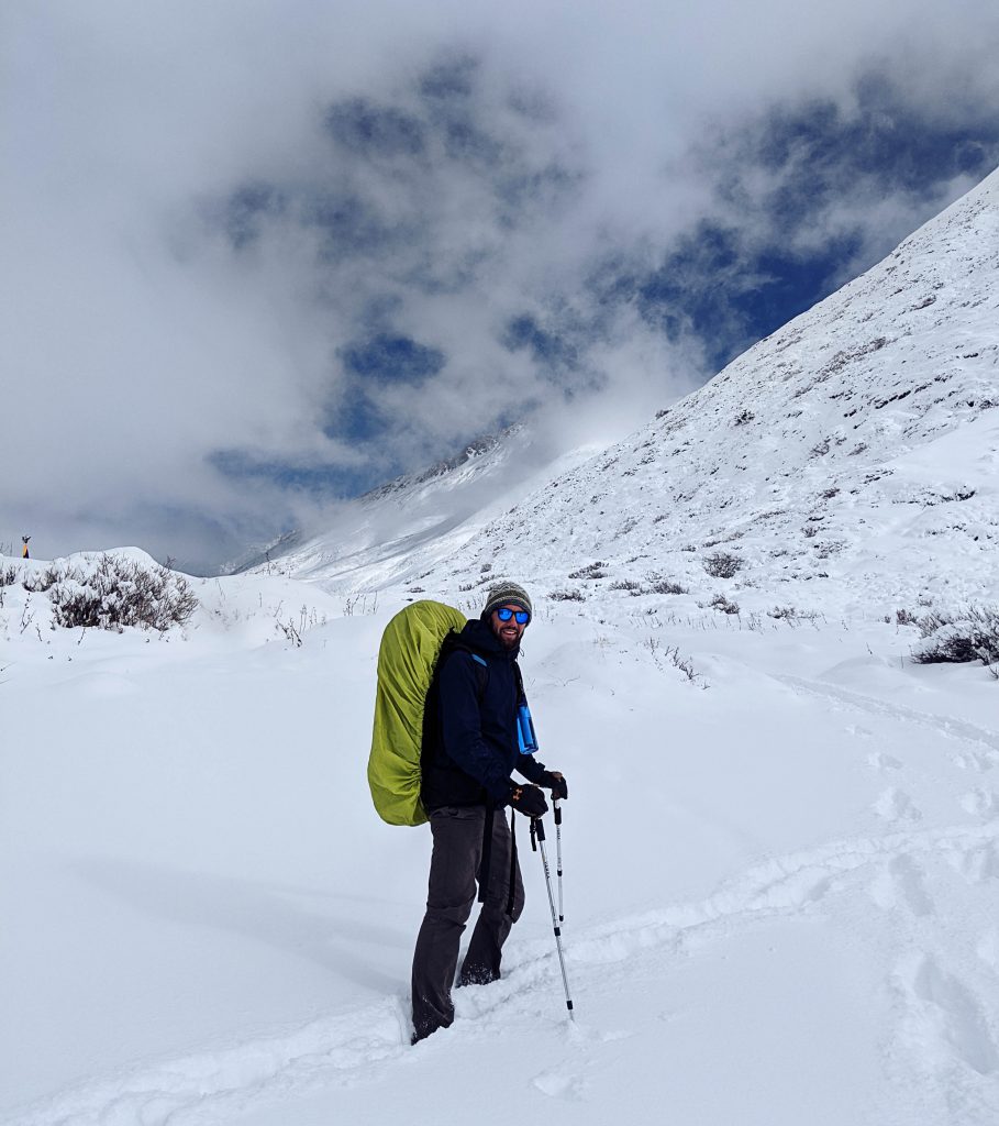 Wir schlugen uns durch hüfthohen Schnee ohne zu sehen, ob wir auf dem wirklichen Weg waren. Wir konnten lediglich erahnen, ob wir auf dem schmalen Wanderweg liefen oder, ob wir auf Büschen abseits des Weges unterwegs waren. Wir wechselten uns immer wieder in der Führung ab, um den Weg zu „brechen“. Da die Sonne den ganzen Tag über geschienen hatte, war die oberste Schneeschicht angetaut und darunter wieder gefroren, sodass eine leichte Eisschicht auf dem Schnee lag. Diese Kombination aus anstrengender Wanderung – wir mussten unsere Füße meistens in die Fußstampfen des Vordermanns manövrieren und diese dazu immer Hüfthoch anheben – und der Höhe machte das Ganze bereits zu einem Abenteuer. Ich war noch nie zuvor auf einer solchen Höhe und tue mich auch immer noch schwer damit in Worte zufassen, was diese mit dem Körper macht. Ich bin zwei Meter gegangen und war außer Atem. Ich hatte aber das Gefühl der Sauerstoff aus der Luft kommt überhaupt nicht in meinen Lungen/Blut an. Die Luft hatte keine Substanz. Sie war einfach dünner.