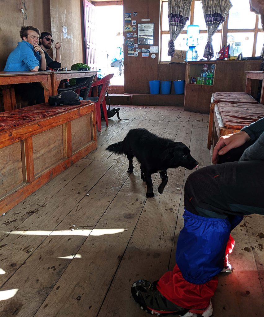 Fun fact: Der Hund, der uns schon einige Tage begleitete ist ebenfalls zusammen mit der Truppe vom Vortag über den Pass gewandert. Später erfuhren wir, dass immer wieder Hunde auf der Hoffnung nach Futter Touristen über den Pass begleiten würden.