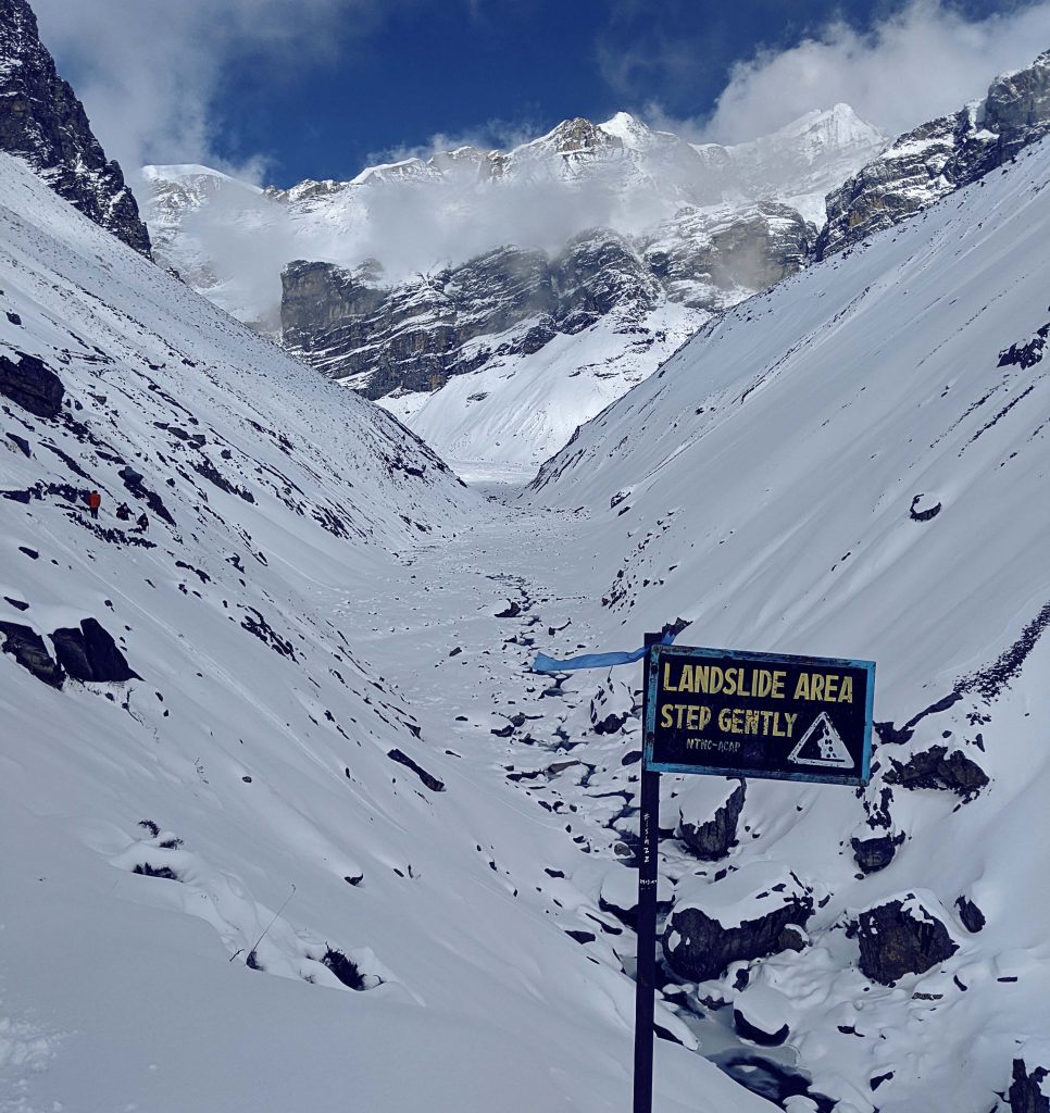 Dann kam ein Abschnitt, der rückblickend betrachtet wirklich gefährlich war. Wir waren allerdings im Tunnel und haben diese Gefahr zwar wahrgenommen, uns blieb zu diesem Zeitpunkt aber nichts anderes übrig als da durch zu wandern. Ich spreche von einem Abschnitt, der von einem Schild eingeläutet wurde, welches Lawinengefahr voraussagte. Stellt euch vor, dass der bisherige Wanderweg schon schmal gewesen ist. Dieser wird nun noch schmaler. Ihr seht eine einzige weiße schiefe Ebene vor euch. Ihr wisst irgendwo auf dieser Ebene liegt der Weg. Ihr wisst nur nicht wo. Rechts daneben geht es gefühlt 500m steil in die Tiefe und links ebenso steil bergauf. Mir ist erst nachher aufgefallen, dass in dieser Passage niemand ein Wort gesprochen hat. Es war mucksmäuschenstill. Nur das Knacken im Schnee und die angestrengte Atmung der Leute waren zu hören. Die Blicke wanderten immer wieder zwischen Konzentration auf die Füße und den Berg hinauf.