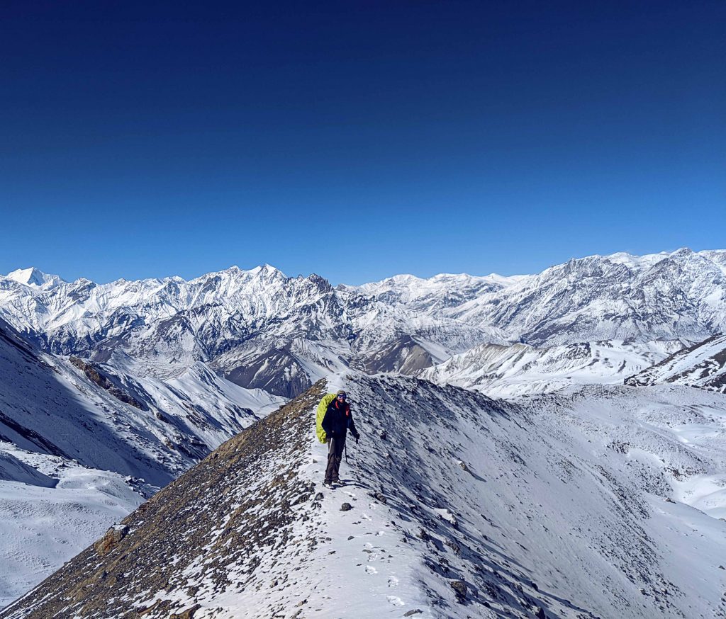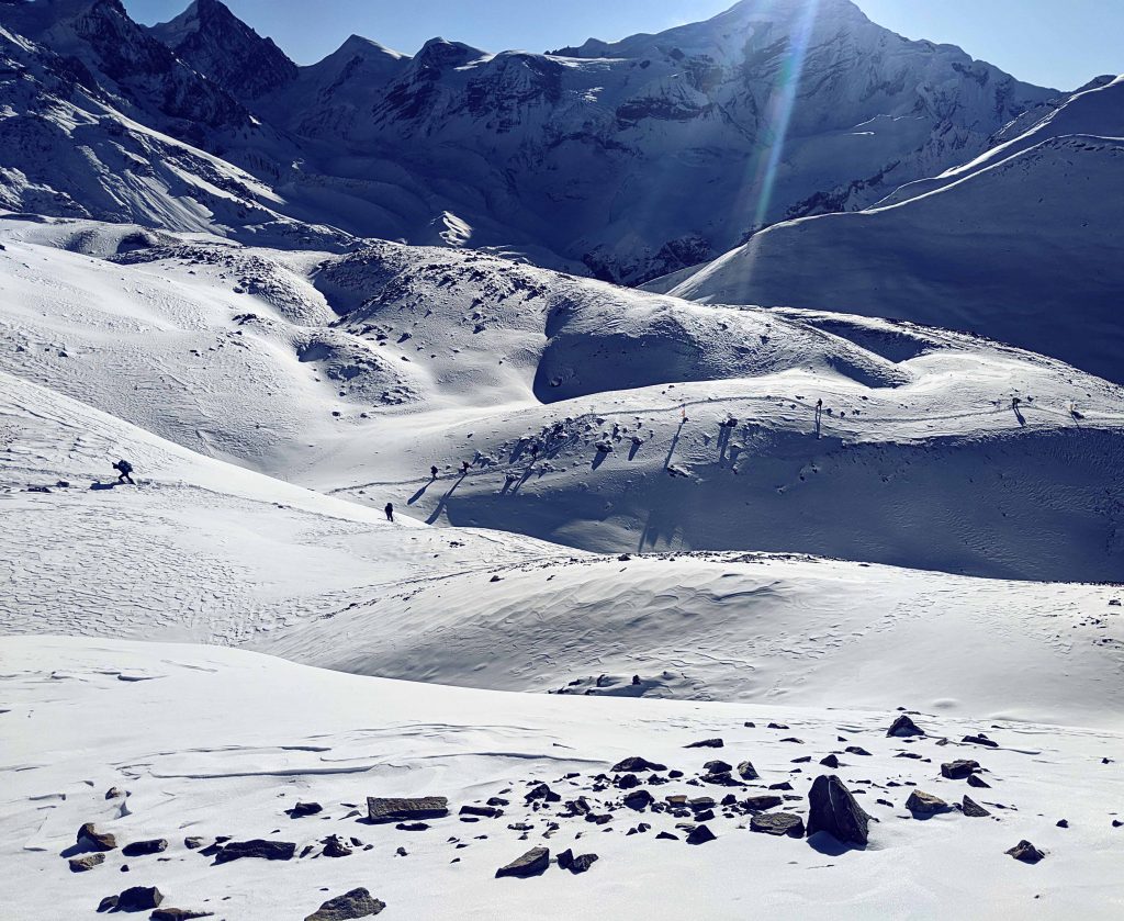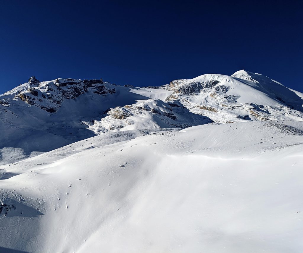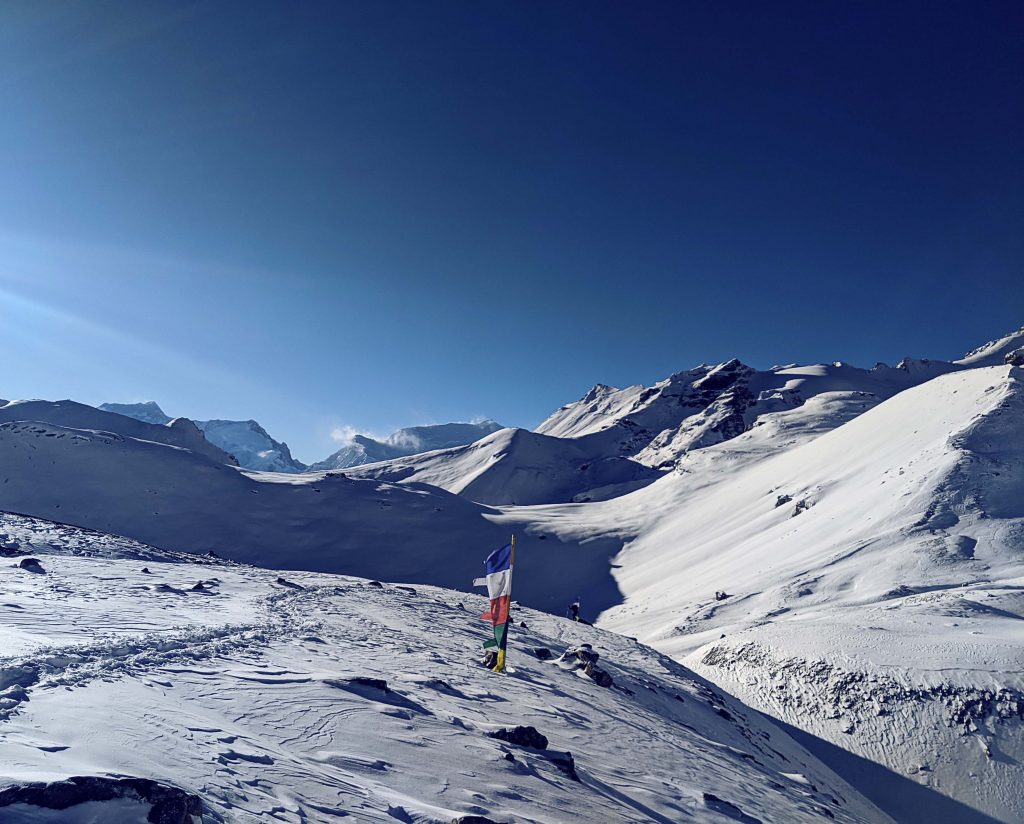 Nachdem die Sonne aufgegangen war, legte sich auch schnell die Kälte und es wurde sogar warm unter den vielen Schichten. Ich will nicht sagen, dass es einfach war den Weg zum Pass zu gehen. Vielleicht hat es sich einfach nur super angefühlt als „Bergführer“ diese unberührte weiße Berglandschaft vor sich zu sehen. Eine unbeschreibliche Weite bot sich unseren Augen, wie ich sie noch nie gesehen habe. Es fühlte sich so an, als ob wir nun wirklich auf dem Dach der Welt angelangt waren.